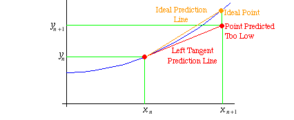 Instead of focussing on the initial, left end-point where we formed our tangent line, consider the interval spanned by the tangent line segment as a whole. As we've already noted, the tangent line from the left underestimates the slope of the curve for the entire width of the interval from the current point to the next predicted point, and as a result of this, the points along the tangent line have vertical coordinates which are all underestimates of those of the points lying along the actual solution curve, including the all-important right end-point of the interval under consideration. (After all, it is this point which forms the next component of our evolving numerical solution.)
