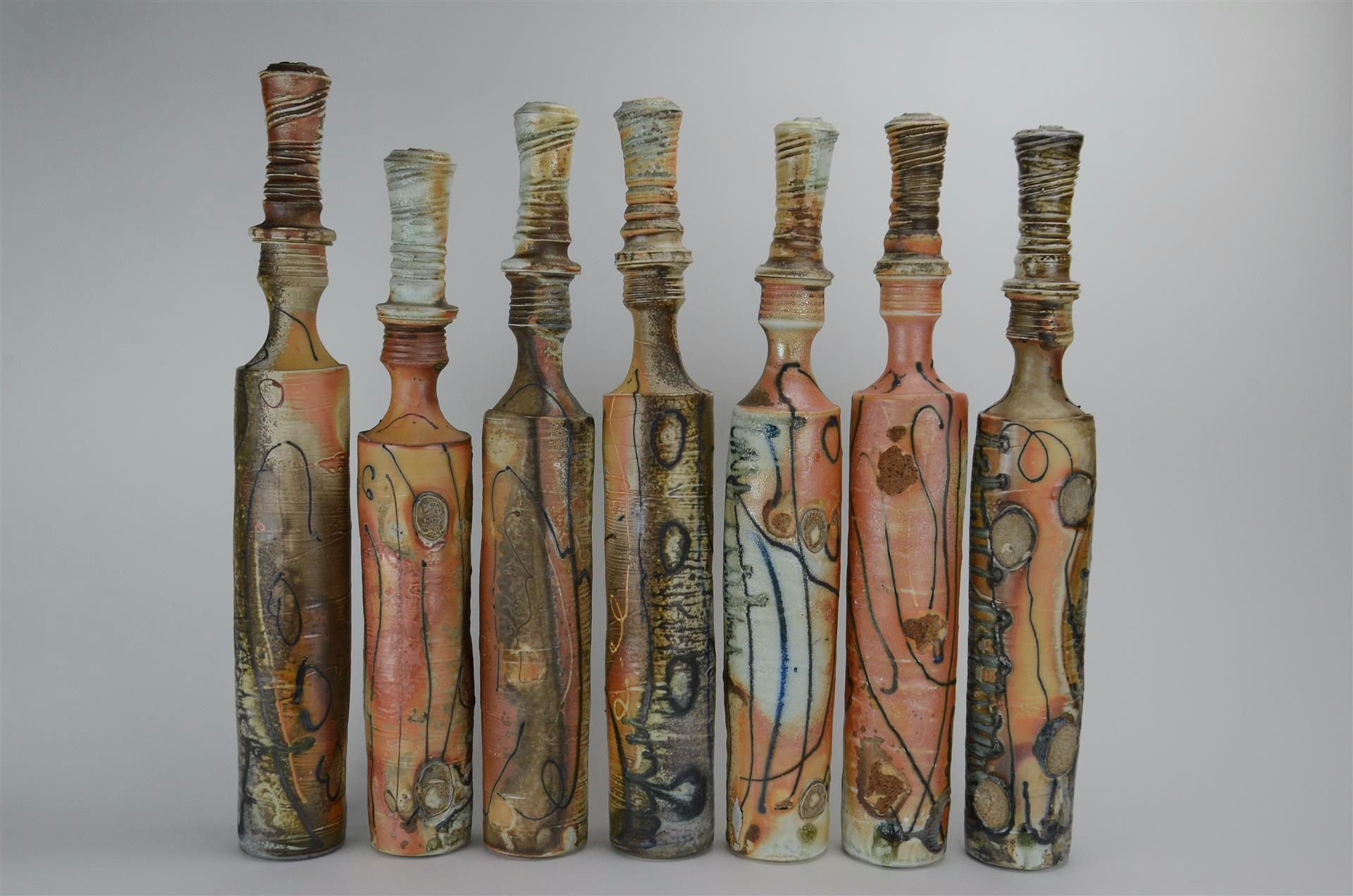 A desire to have objects that fulfill specific purposes inspires me to make functional pots. The infinite and elusive variety of texture and color attainable through the various making and firing processes that I use has generated an interest in presentation. I enjoy presenting my work so that a viewer might notice and appreciate subtle differences in form and surface. By grouping similar forms of differing size and color I hope to compose a visually dynamic display, which invites the viewer to enjoy the tactile nature of each individual piece and how they relate to one another.