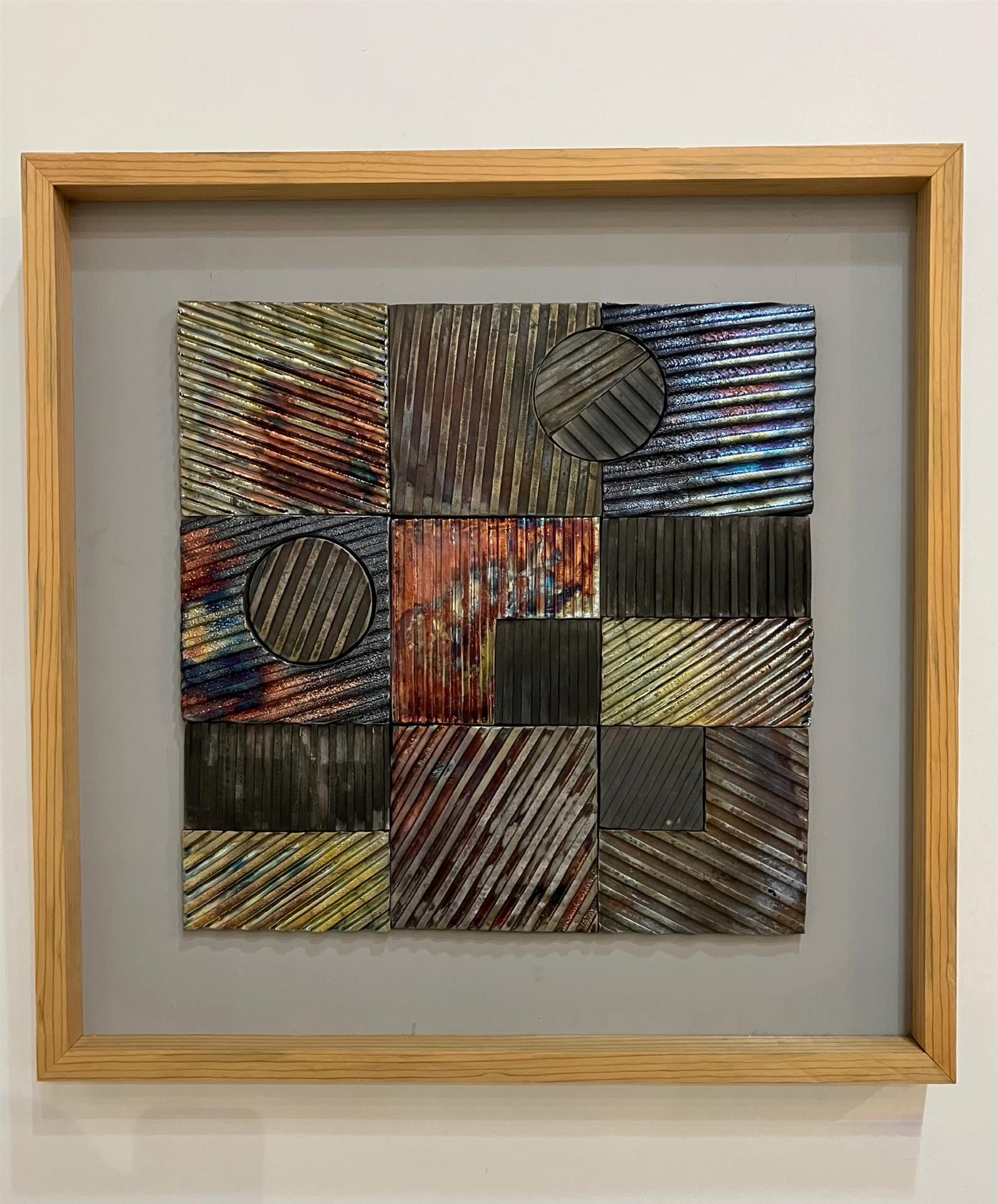Have you ever flown over any of the agricultural areas of the Midwest? Have you ever done this when the moon is full or nearly full? “On the Night Flight to Wichita” recalls just such an experience. With family ties to Wichita and making numerous trips for holidays and other occasions, Joe recalls his experiences of looking down from an elevation of 30,000+ feet onto the moonlit patchwork landscape of the Kansas farmland below. Rectangular plots and circular areas defined by the rotation of irrigation systems are represented by a mosaic of iridescent Raku fired tiles.