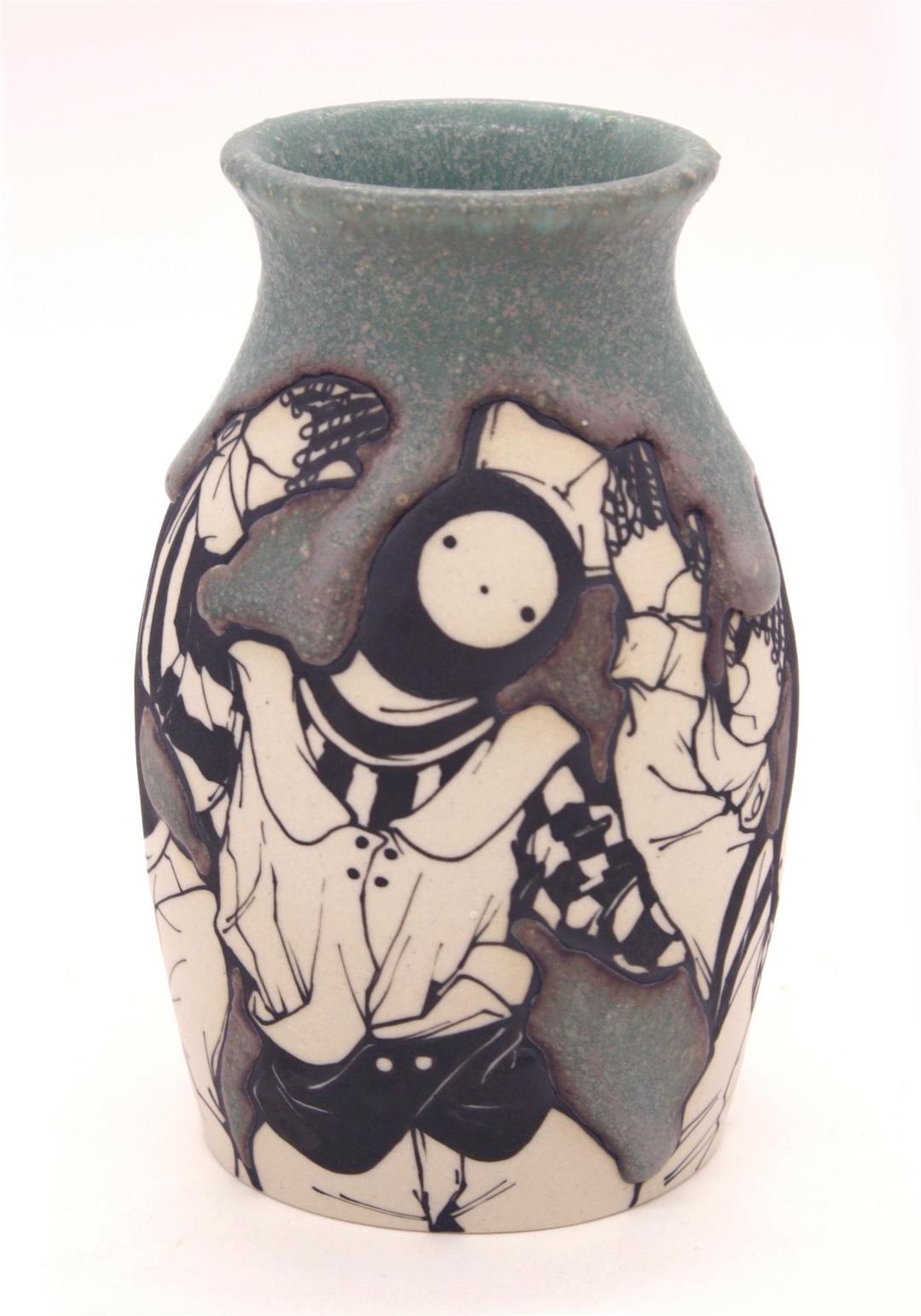 Porcelain vessels are thrown on a wheel and then decorated with illustrations that envelop the form seamlessly. The drawings often depict stylized characters and occasionally emulate techniques common to comic books and animation.