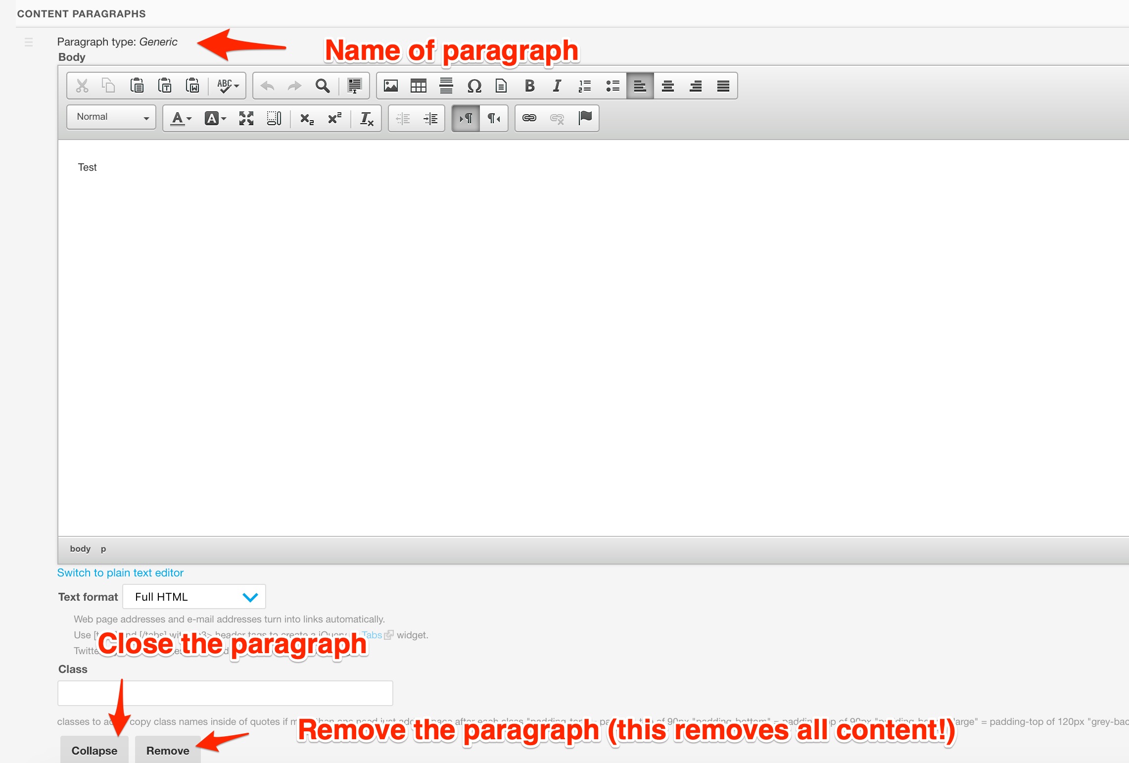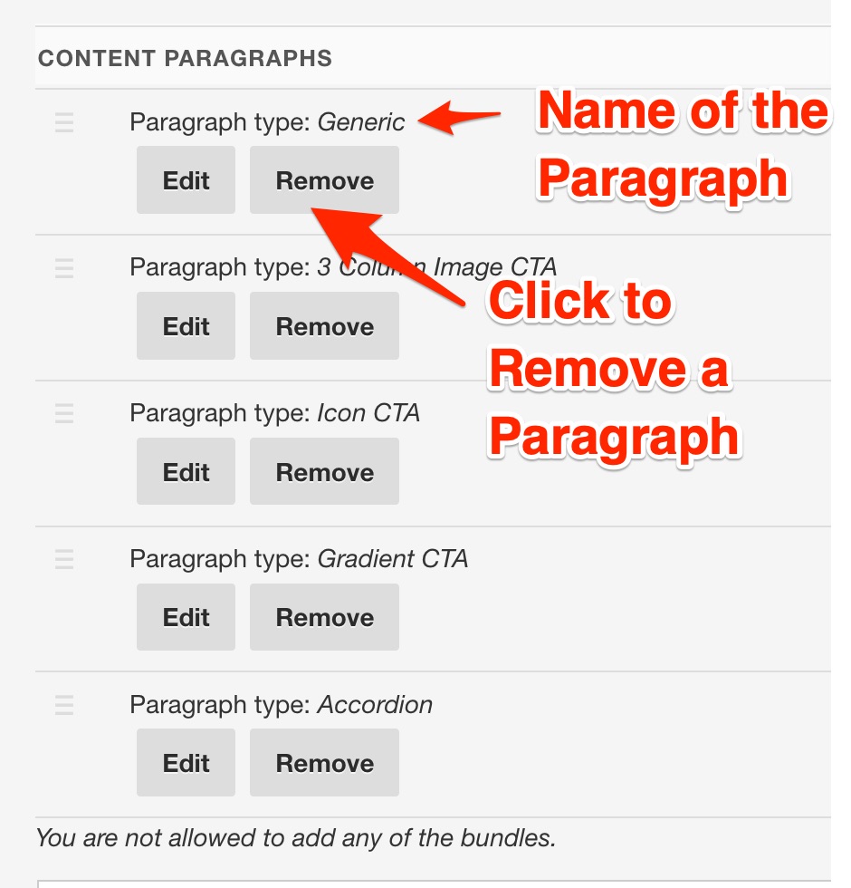 To remove a paragraph from a node, click the Remove Button under the name of the paragraph you wish to remove (if not expanded) or under the pagraph (if expanded). Note that removing the paragraph will also remove all of the content inside of the paragraph.