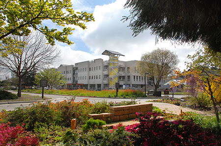 Funded by a combination of Delta's 2004 Measure L Bond and state matching funds, the $74 million three story Science and Mathematics Building is replacing the outdated Cunningham Building, which is slated to be demolished as per the matching funds agreement. The new building incorporates materials and colors that reflect the modern "Village" character of existing campus centers. Highlights include a striking enclosed center atrium, which no doubt will become a popular student meeting place.
