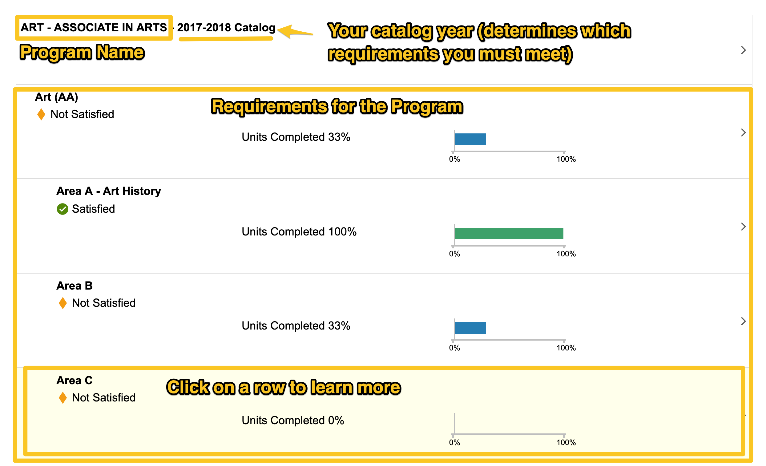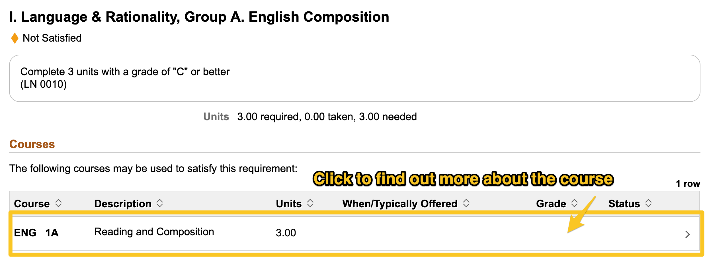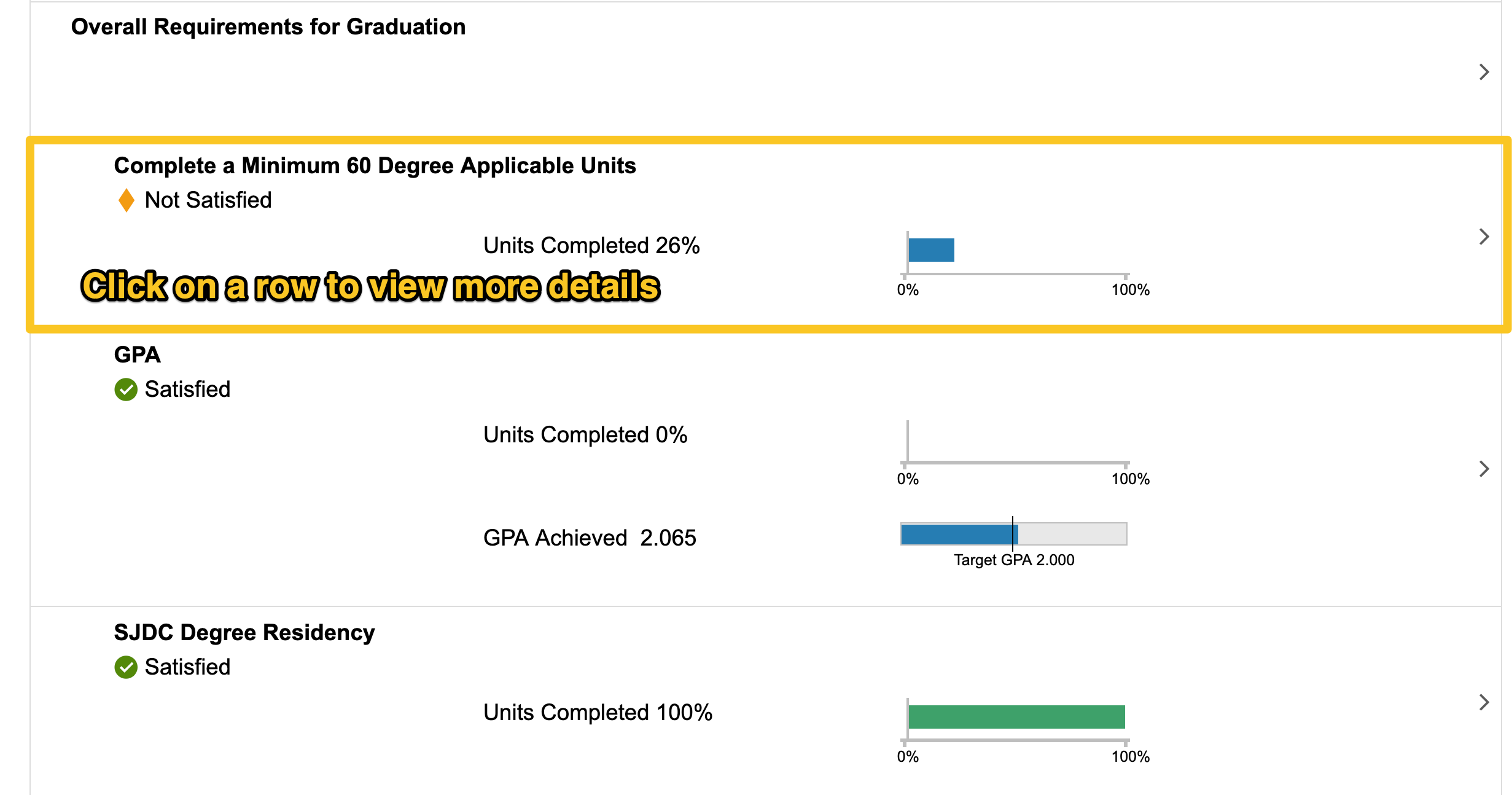 - Click on any row to view of list of the courses that were used to satisfy the requirements.