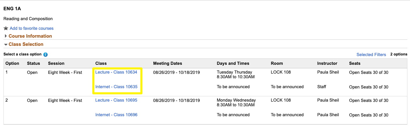 If the course you’re searching for has multiple components such as both a Lecture and a Laboratory, the list under Class Selection will display all of the possible combinations for the course.