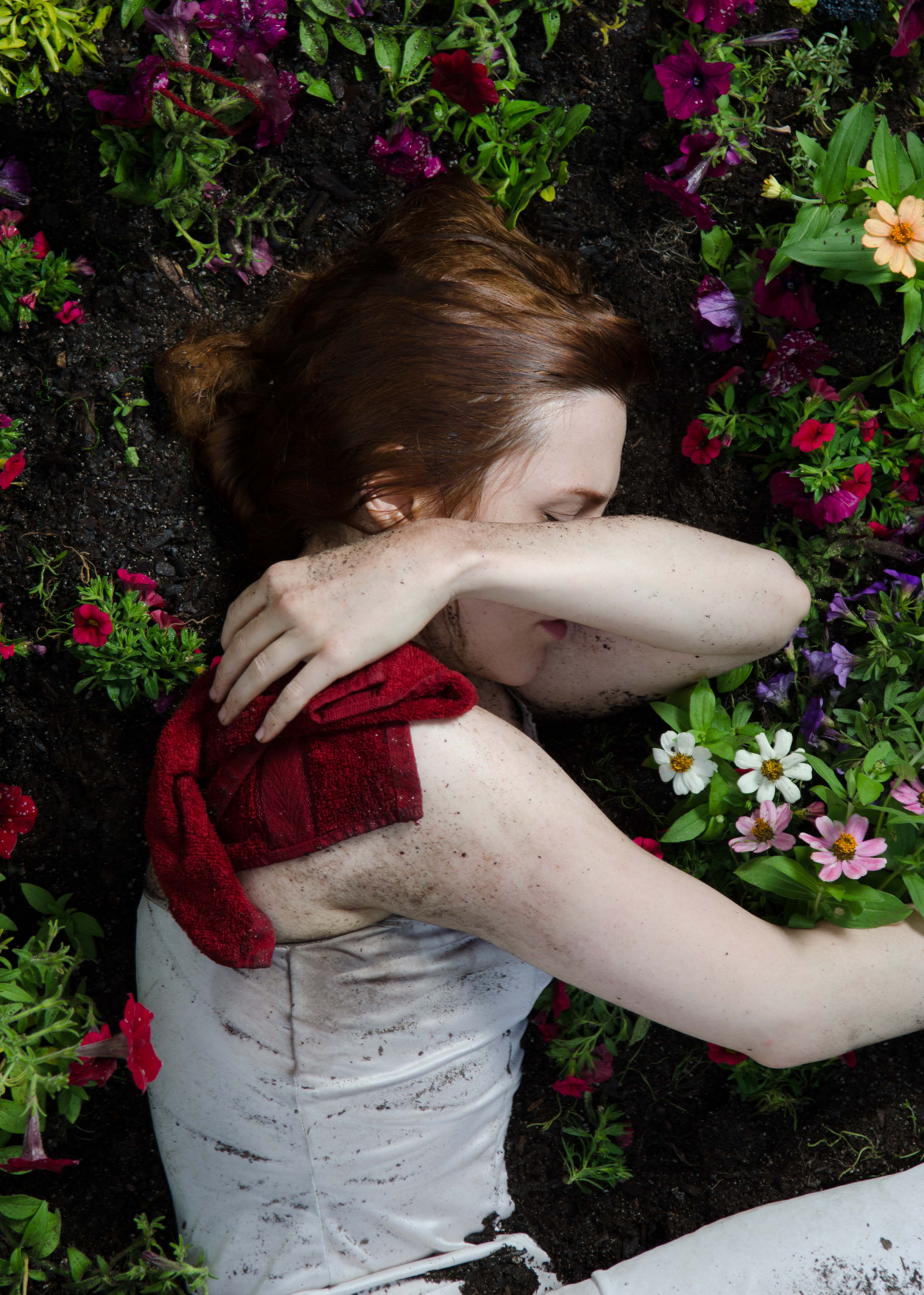 Humankind is made of both dirt and the divine yet is at one with neither. Encased in our bodies of dust, we strive for redemption and transcendence. We struggle. We scour. We reach. We burgeon- even as we tarnish and disintegrate. This work explores themes of growth and decay, original sin and redemption, and perseverance despite futility. We see a girl quietly engaged in daily rituals of self-cleaning while entombed in dark, loamy garden soil. As the girl comes undone, a bloom of brightly colored flowers emerge. This imagery reflects my personal belief that humans are fragile, blind, and irreparably flawed yet eternally hopeful in the midst of a hostile world. To create this series, I built a 6x8 foot raised garden bed on my back patio and filled it with planting soil and live plants and flowers. The model had to be dug in and out between each shot and each plant and flower replanted. The images were photographed from a ladder positioned seven feet above the planter.