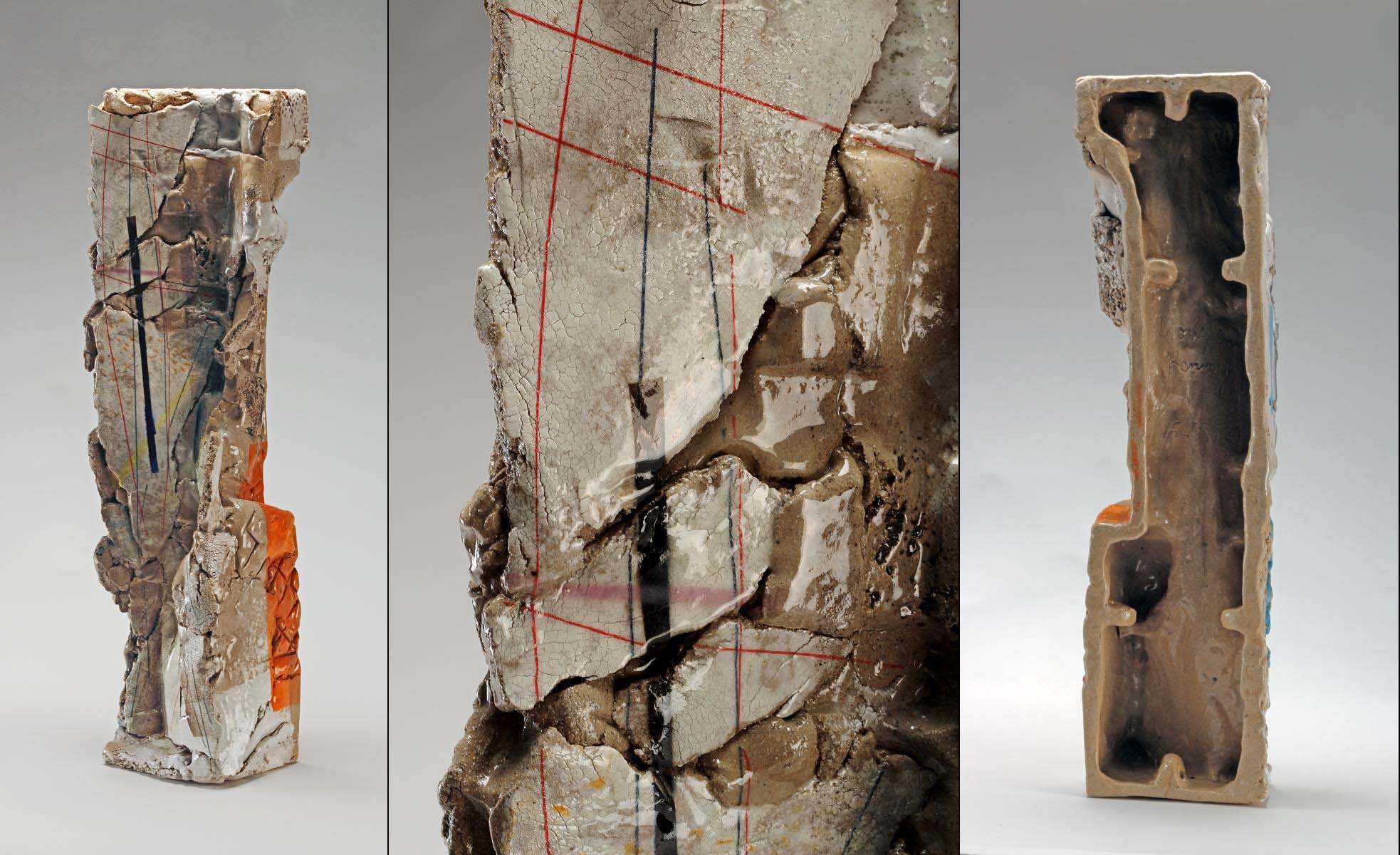 Cone 5 ceramics, buff sculpture clay, press molded slabs into a cinder block mold, white slip, kaolin and underglazes, clear glaze, fired standing in an electric kiln.
