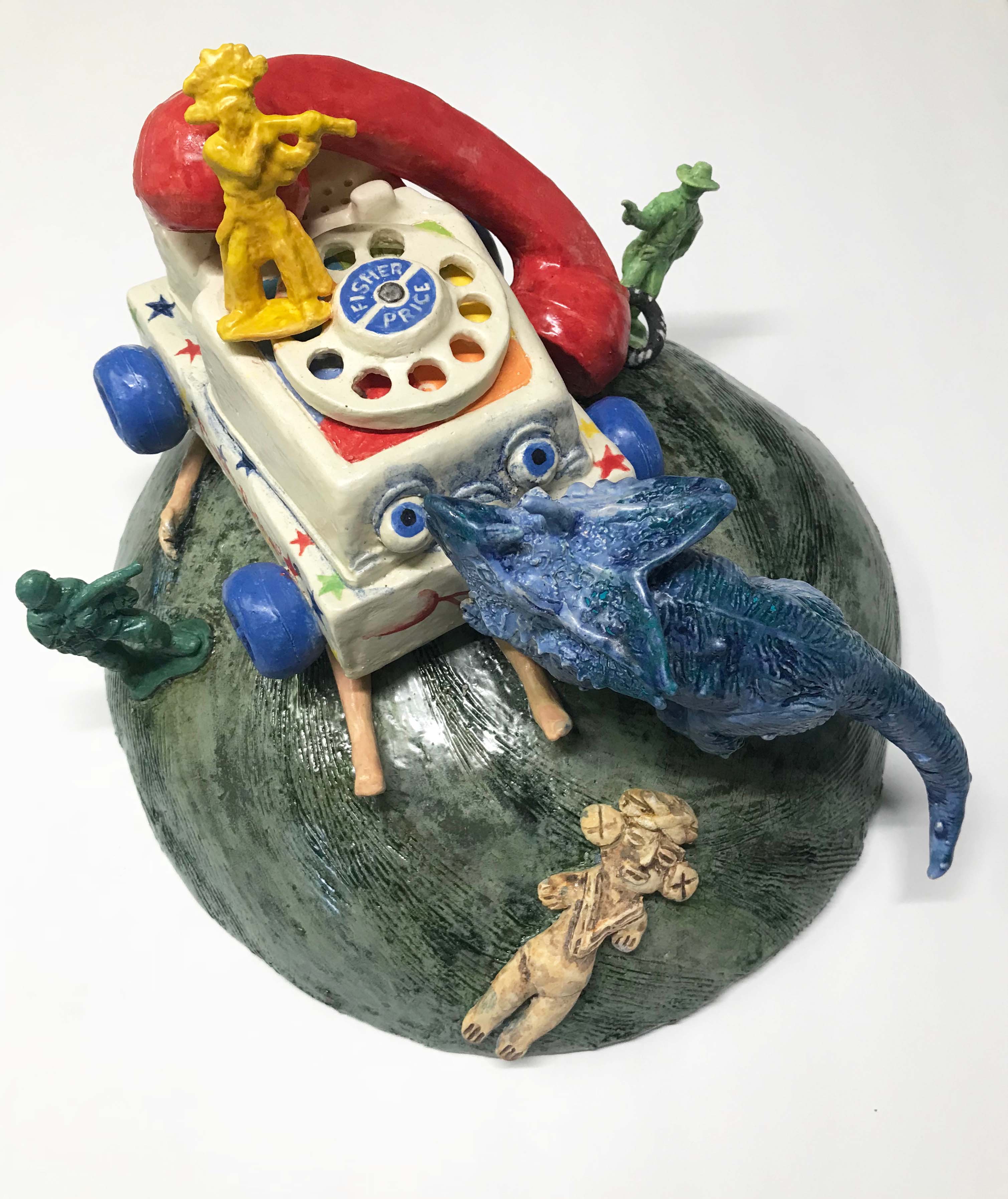 Child’s Play, Hit & Run uses iconic toys and stereotypes to show the battle of nature vs nurture. These hand-built ceramic symbols of obsolete objects point to many issues that plague our society: gender and race relations, gun violence, the #MeToo movement, communication, and the preservation of cultures.