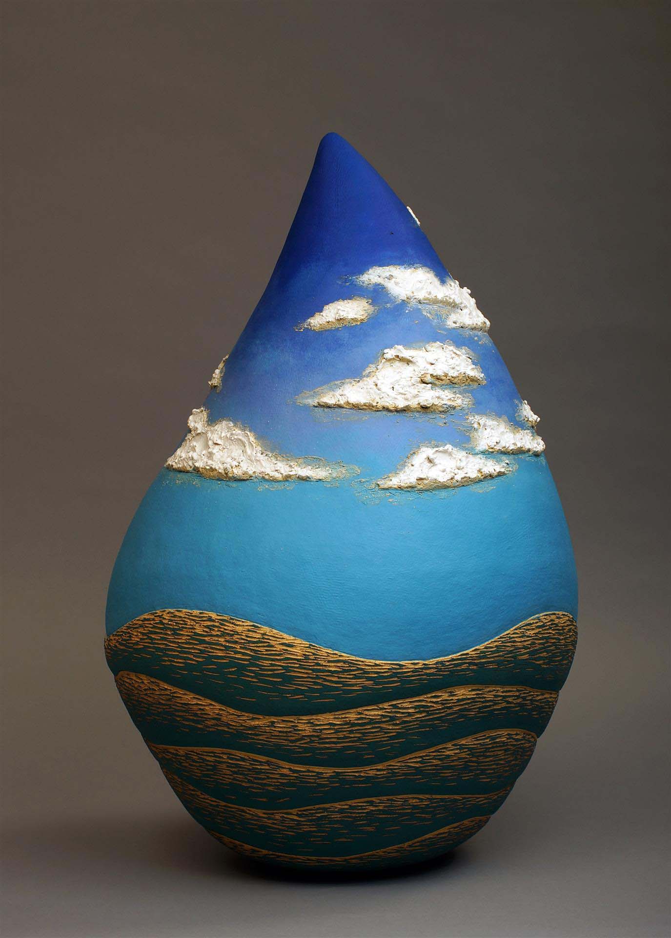 Verdant is an abstract form of a water drop. The water drop form is also a metaphor for life and the environment and represents our physical and spiritual dependence on water. California, where I reside, suffered from severe drought for the past several years. I was inspired by the striking blue sky with breath-taking clouds I saw after a rainstorm in early spring. I used the water drop form as a canvas to depict the sky with clouds and the verdant rolling hills. Without water, the environment depicted in this piece could not exist. This piece is a celebration of our environment and a reminder of the importance water plays in our lives.
