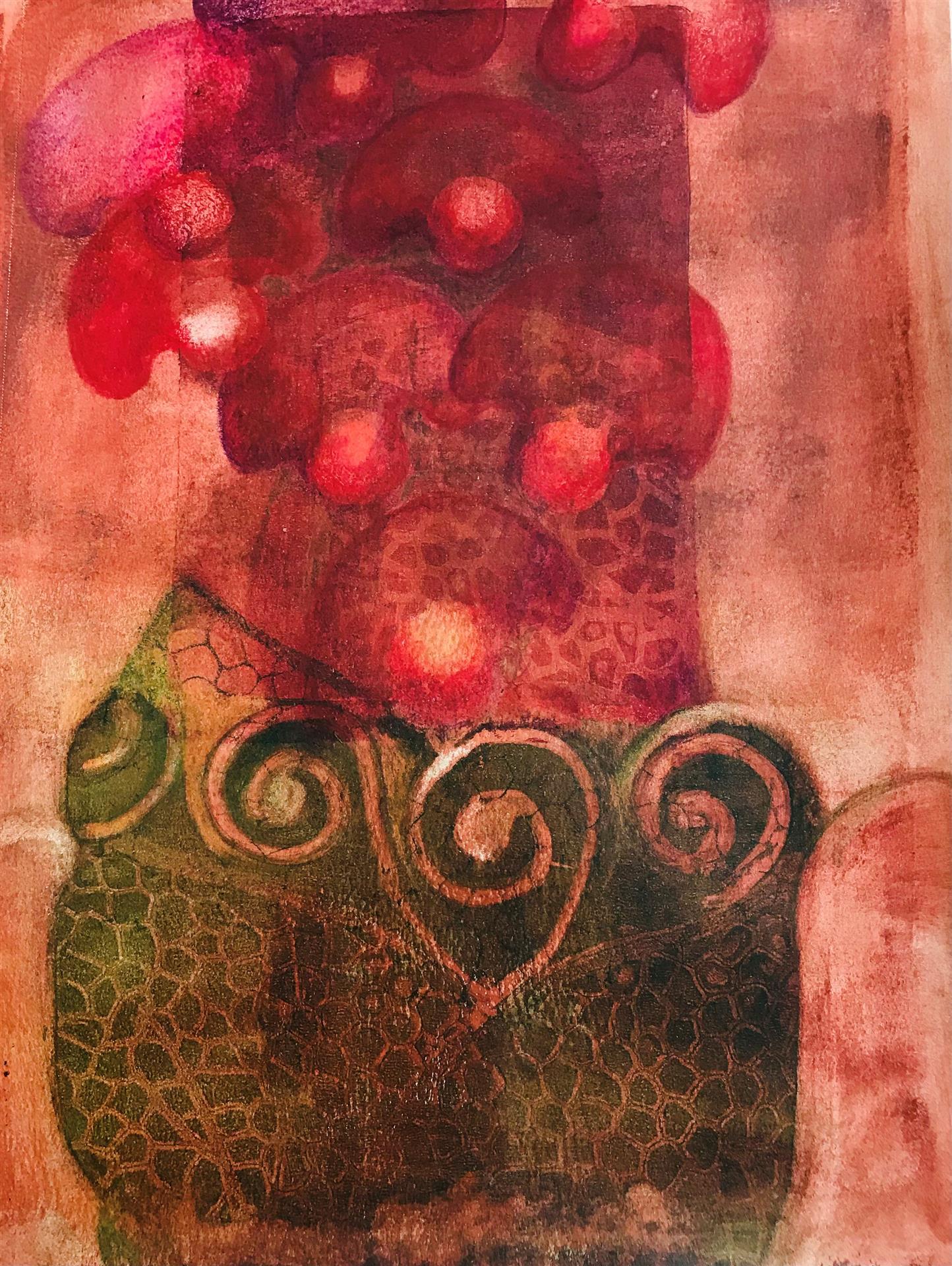 Here, at Delta College, I took three printing classes.  I love printmaking, it has opened new possibilities for my craft and it’s now a part of my creative process.  I often start my work with a printed background, before I move to drawing or painting.  Some of my prints have multiple layers of printed surfaces with patterns I create from carved lino, handmade stamps or found objects.  I prefer using is acrylic paint, although I also use inks, watercolor, pencils and markers.