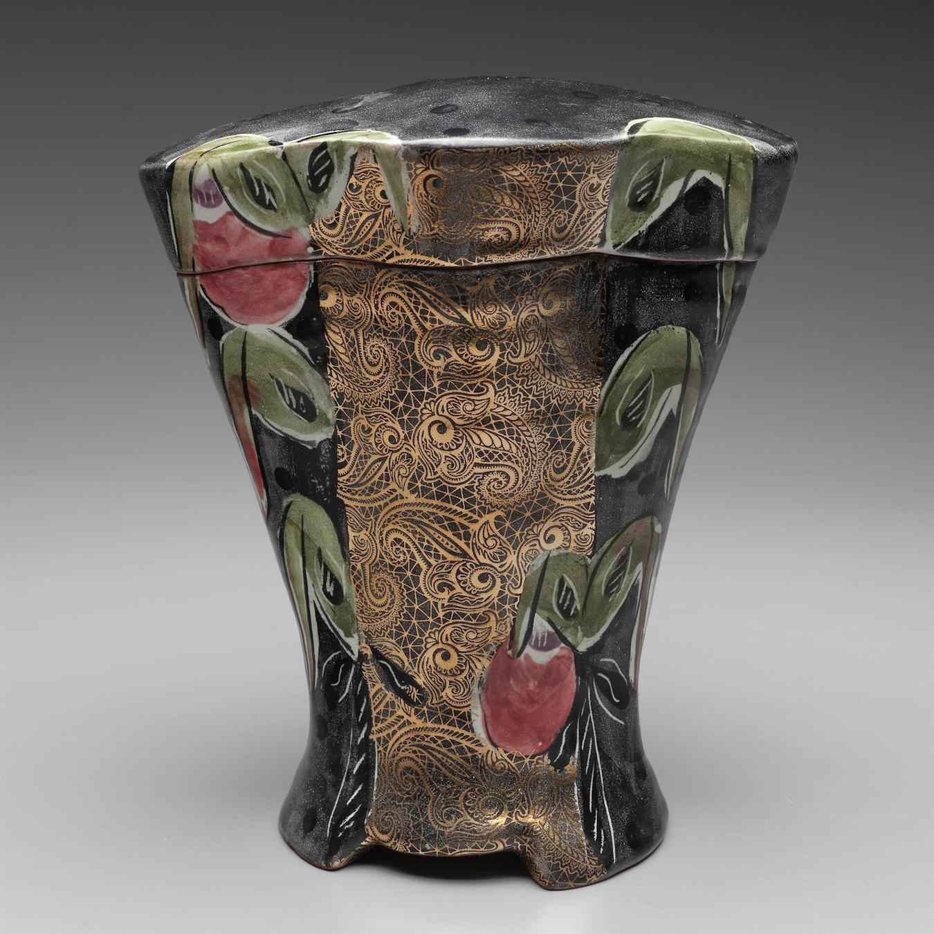 This Paisley Oval Box combines thrown, altered and hand-built sections. These sections are made separately on the wheel and then assembled. I enjoy altering the thrown form and working in this manner because it allows me to make pots of differing forms and shapes.