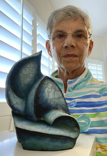 The human figure is always present in my sculpture, even when the work appears very abstract in form. When I create works out of clay, I’m interested in drawing the viewer around the piece in a swirl of implied motion. In the most recent work, several faces have begun to appear, each with a distinct personality. Textured surfaces make the viewer want to touch these sculptures. After firing in an electric kiln, the work is finished with an acrylic patina which highlights surface textures and enhances the form adding color to the completed piece.