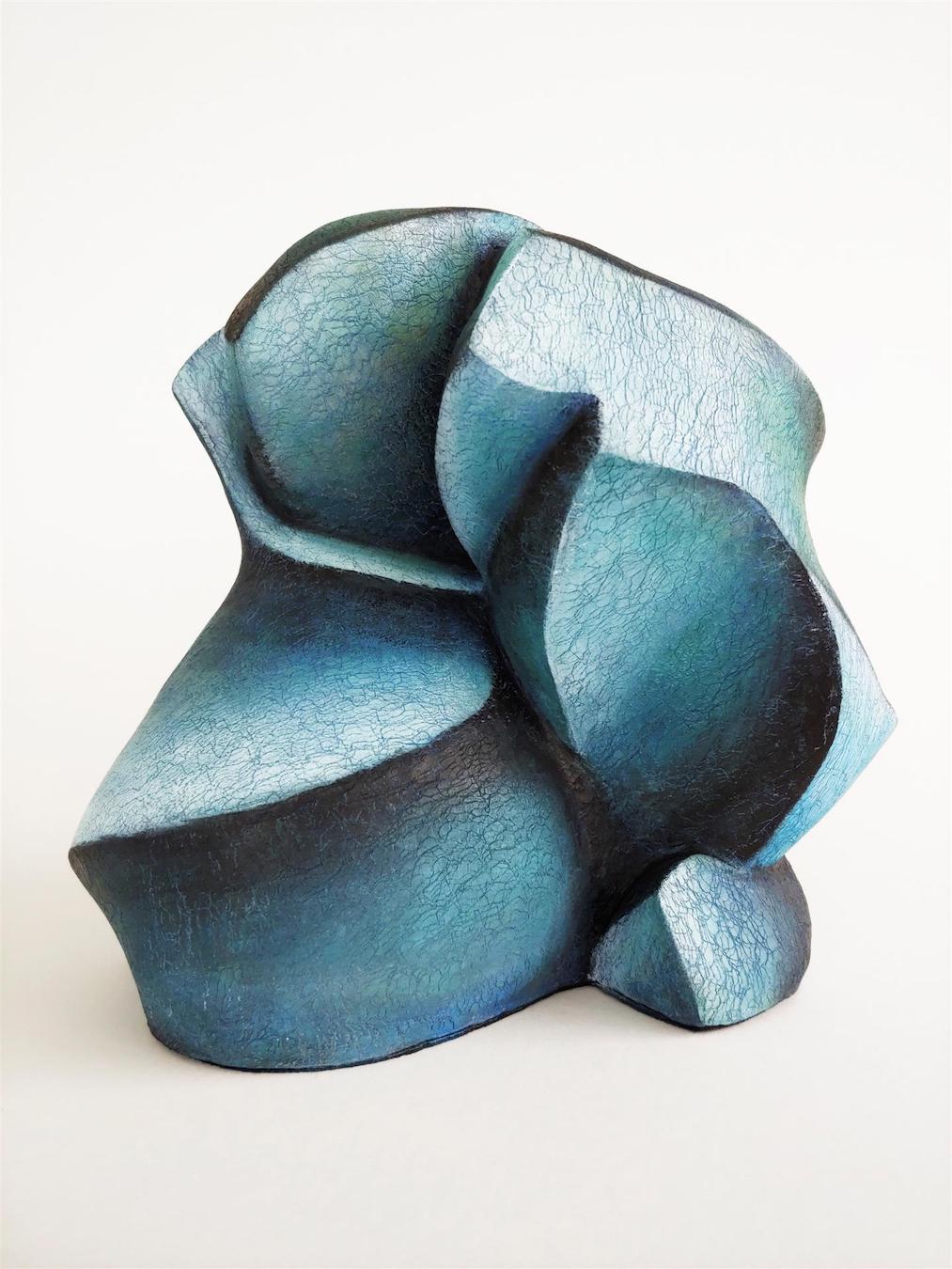 The surface of the piece for Duet has been textured by pressing lace-like material into the leather-hard clay before firing. Surface color is an acrylic patina applied in layers to emphasize edges and bring out the form. The title, “Duet” was selected because the sculpture resembles two abstract figures wrapped around each other.