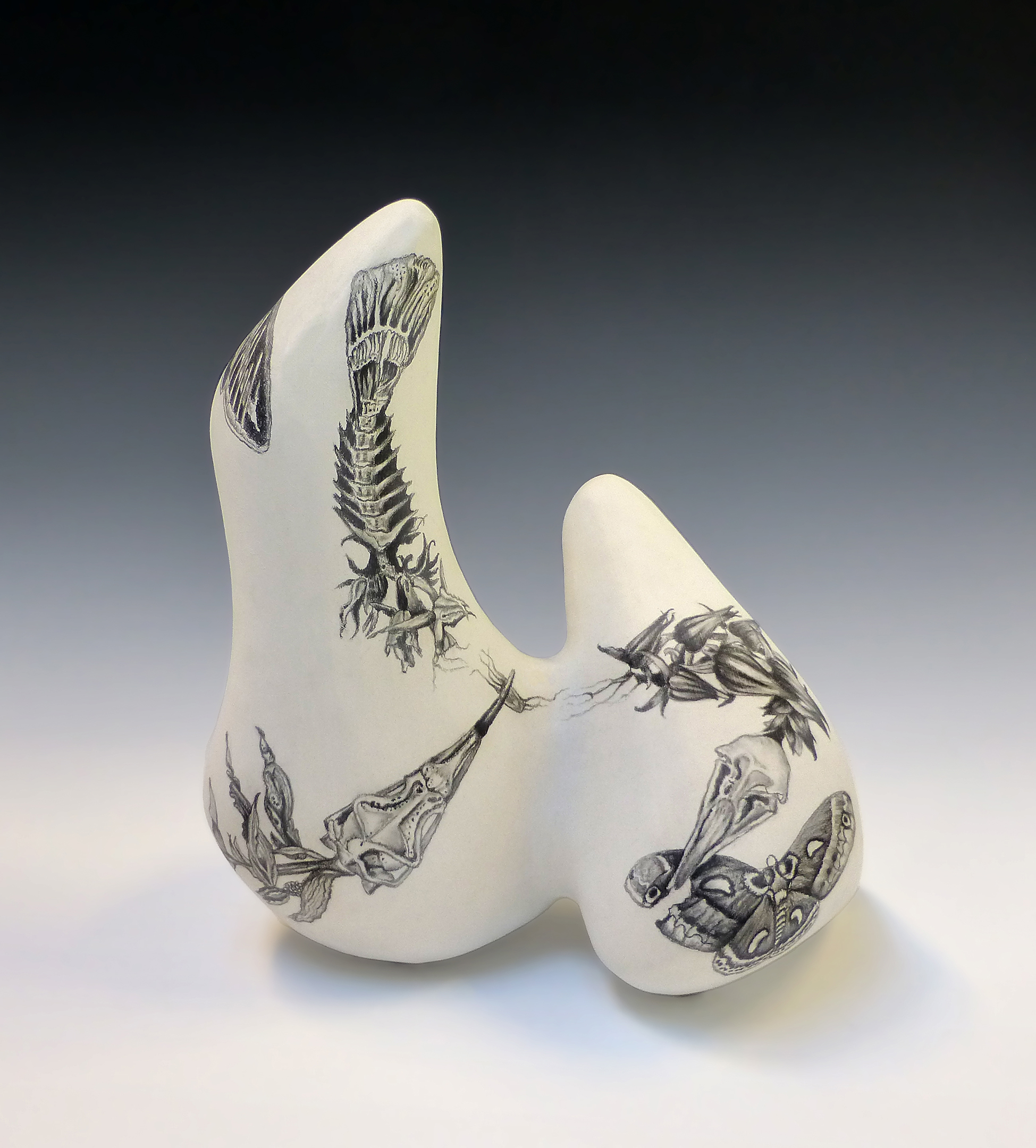 In this body of work, form and surface are combined to meld complementary narratives. They are living things, but do not exist in the past or in the present. The imagery recalls the work of scientific illustrators of the past, transcending time. Through re-imagination and distortion, the viewer is invited to examine and interpret the ambiguous (and sometimes disquieting) forms and images that inhabit these works.