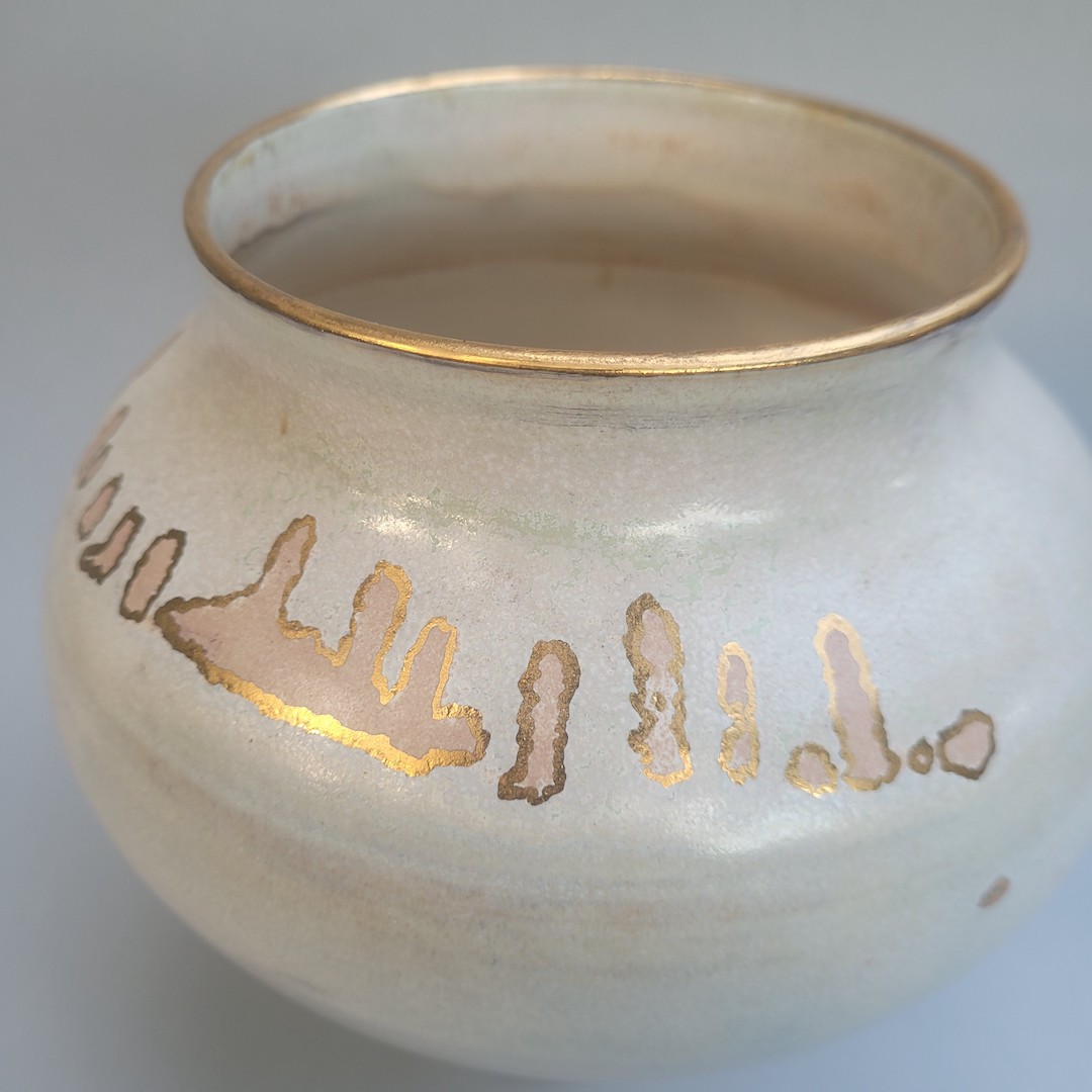 25/25 porcelain, wheel thrown, cone 11 reduction fired with Matt Ivory, and over glaze gold luster