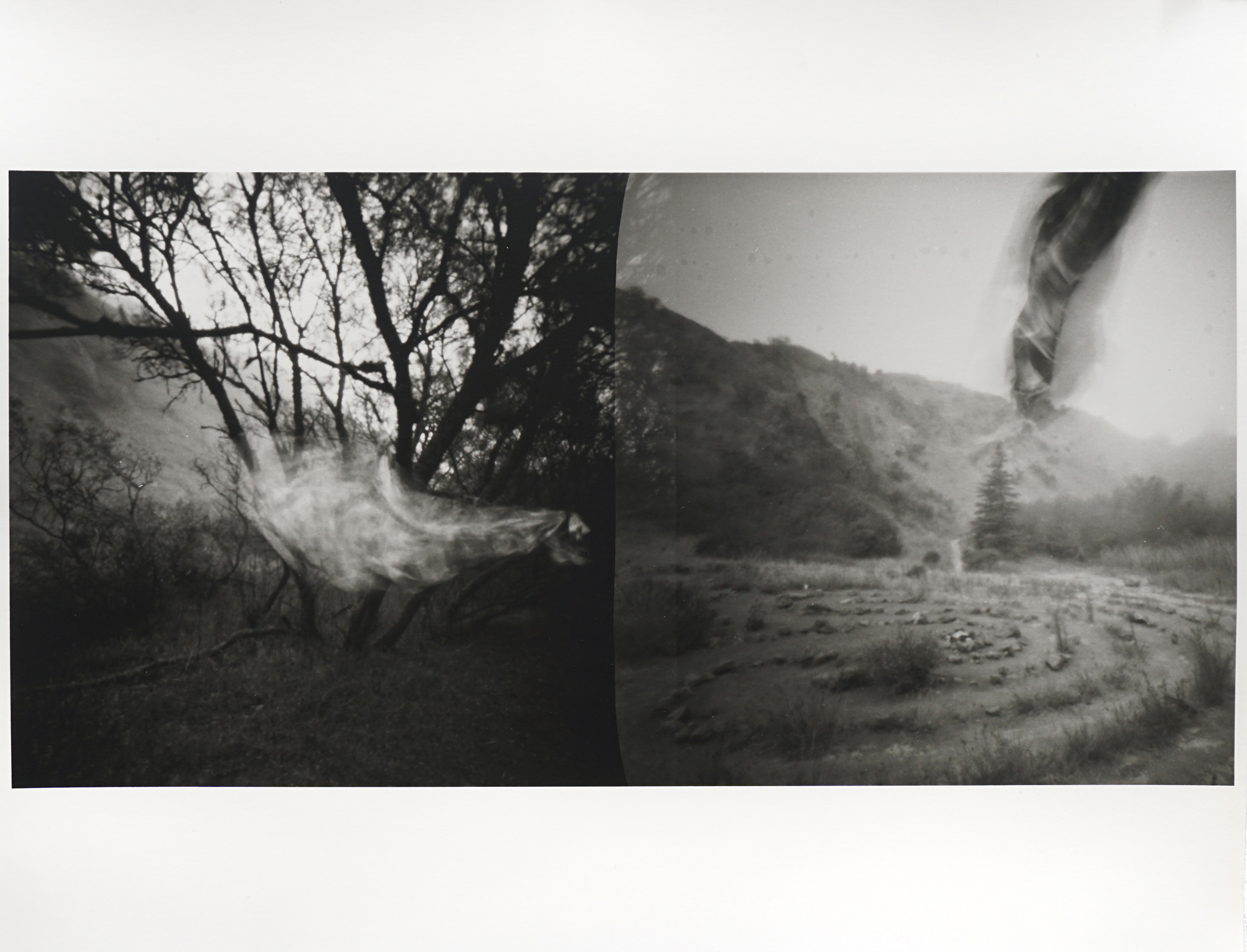 I create experimental photographic work, employing camera-less photography or alternative processes to translate my local surroundings, recast everyday objects, or rewrite my own shadow. I respond to the physicality of my materials and highlight the illusion of texture and depth within the medium. Image fragments and layered exposures communicate the elusiveness of memory. In reference to photo history and the archive, I use repetition, found photographs, and analog methods.