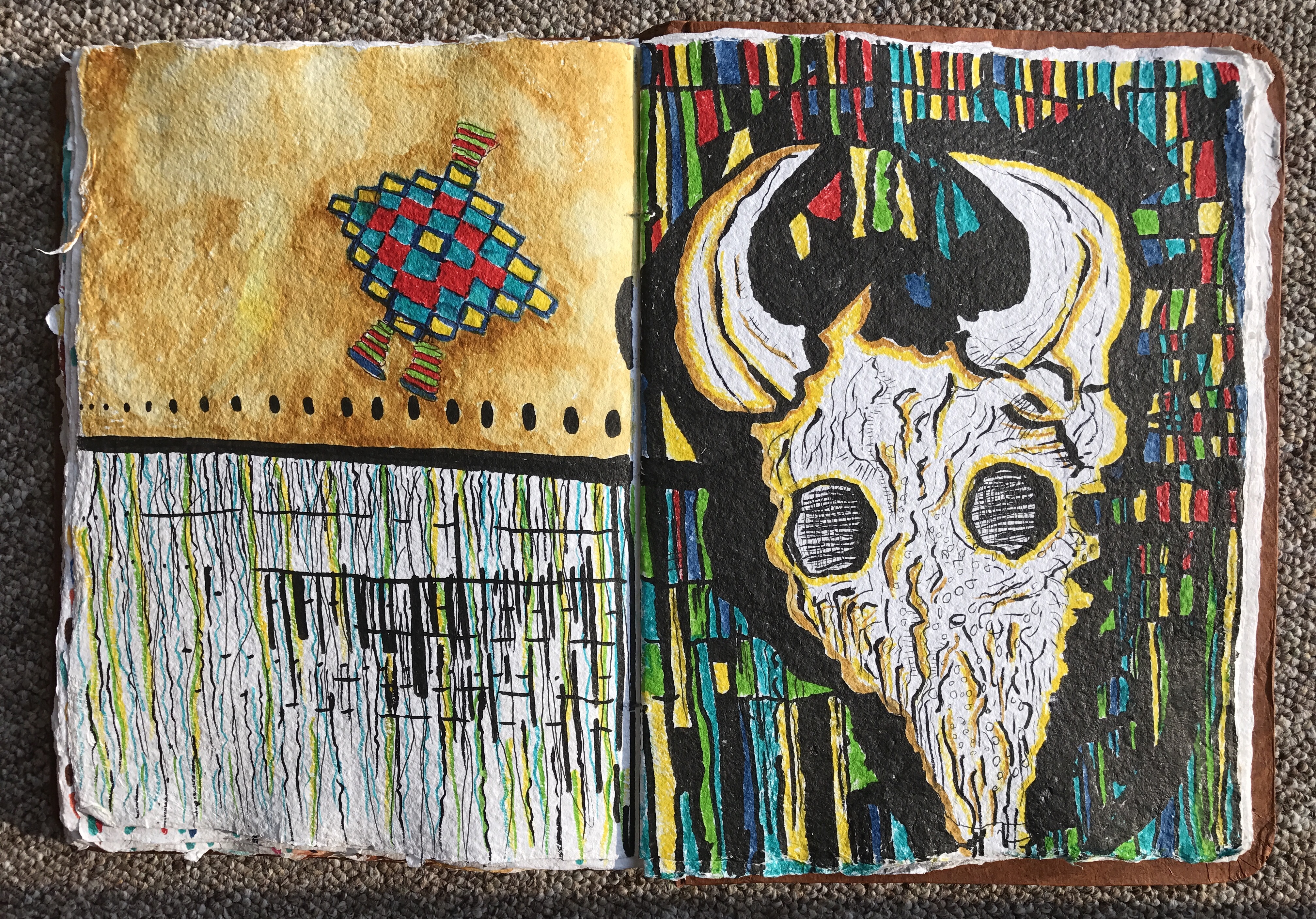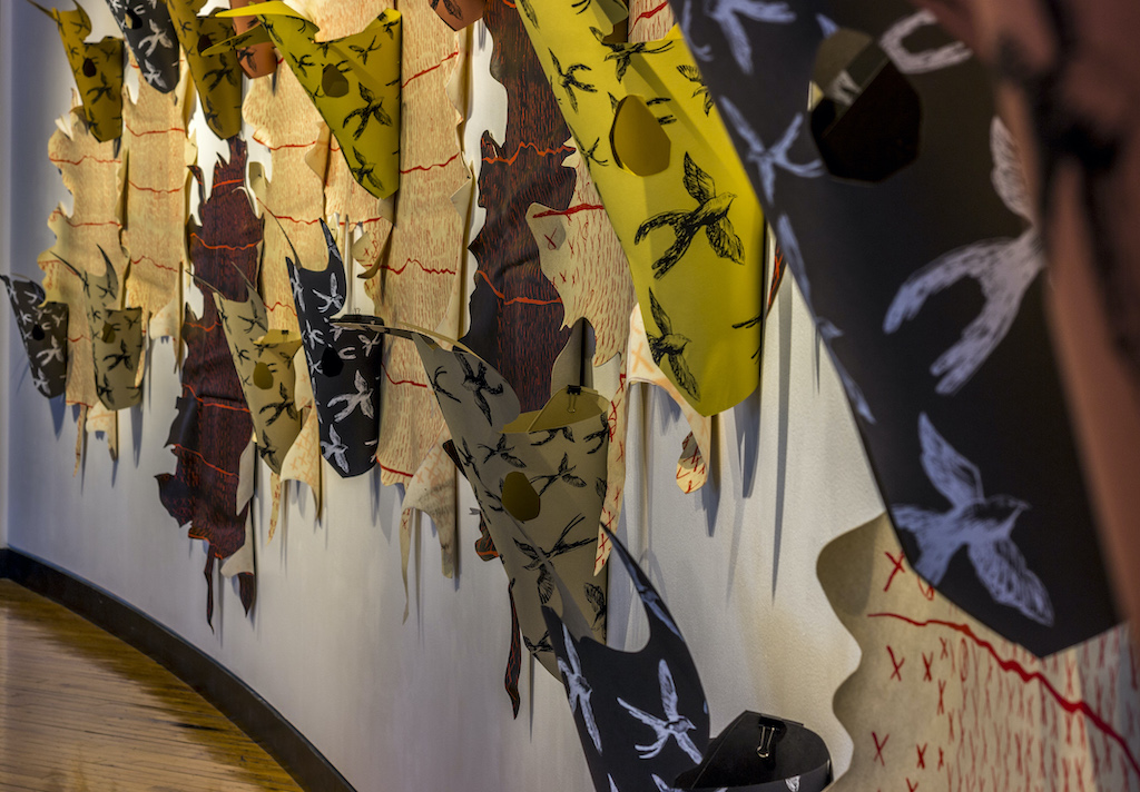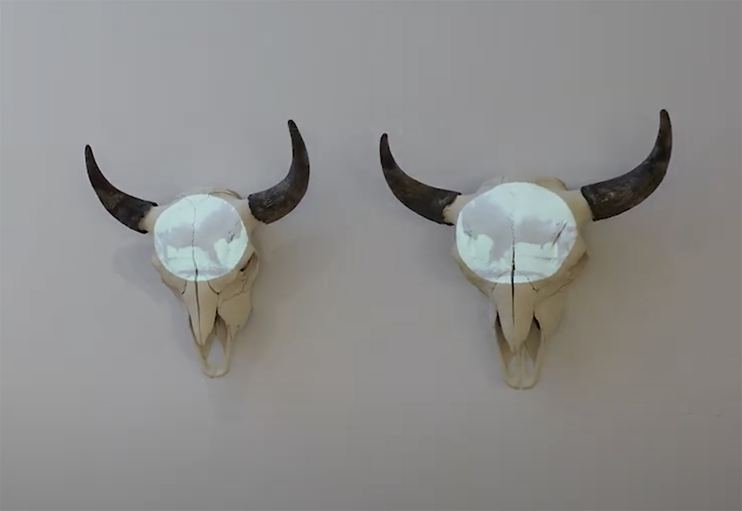 Sound recordings include the artist on pedal steel guitar with soundscapes of cello, clarinet, accordion, and guitars by the band The Stolen Sea. In addition, Jason Cutnose (Kiowa,1967-2015) narrates a story about the Cutthroat Gap massacre in the Wichita Mountains of Oklahoma, Juanita Pahdopony (Comanche) records a Comanche prayer, Hitchcock’s grandfather Saukwaukee John Dussome Reid (Kiowa, 1912-1996) tells a story of the old days on the Southern Plains, and soprano Catlin Mead sings an operatic reinterpretation of Cutnose’s stories. Finally, Intertribal War Dance Songs, recorded in 1978 on the Johnny Reid (Kiowa) and Peggy Reid (Comanche) Dance Ground, make up the soundscape. Video images include War Dancers in Medicine Park, Oklahoma, and buffalo images recorded in the Wichita Mountain Wildlife Refuge by Emily Arthur. The exhibition has an accompanying limited-edition 12-inch vinyl album, CD, and set of letterpress prints available at Sunday Night records: sundaynightrecords.com http://sundaynightrecords.com/