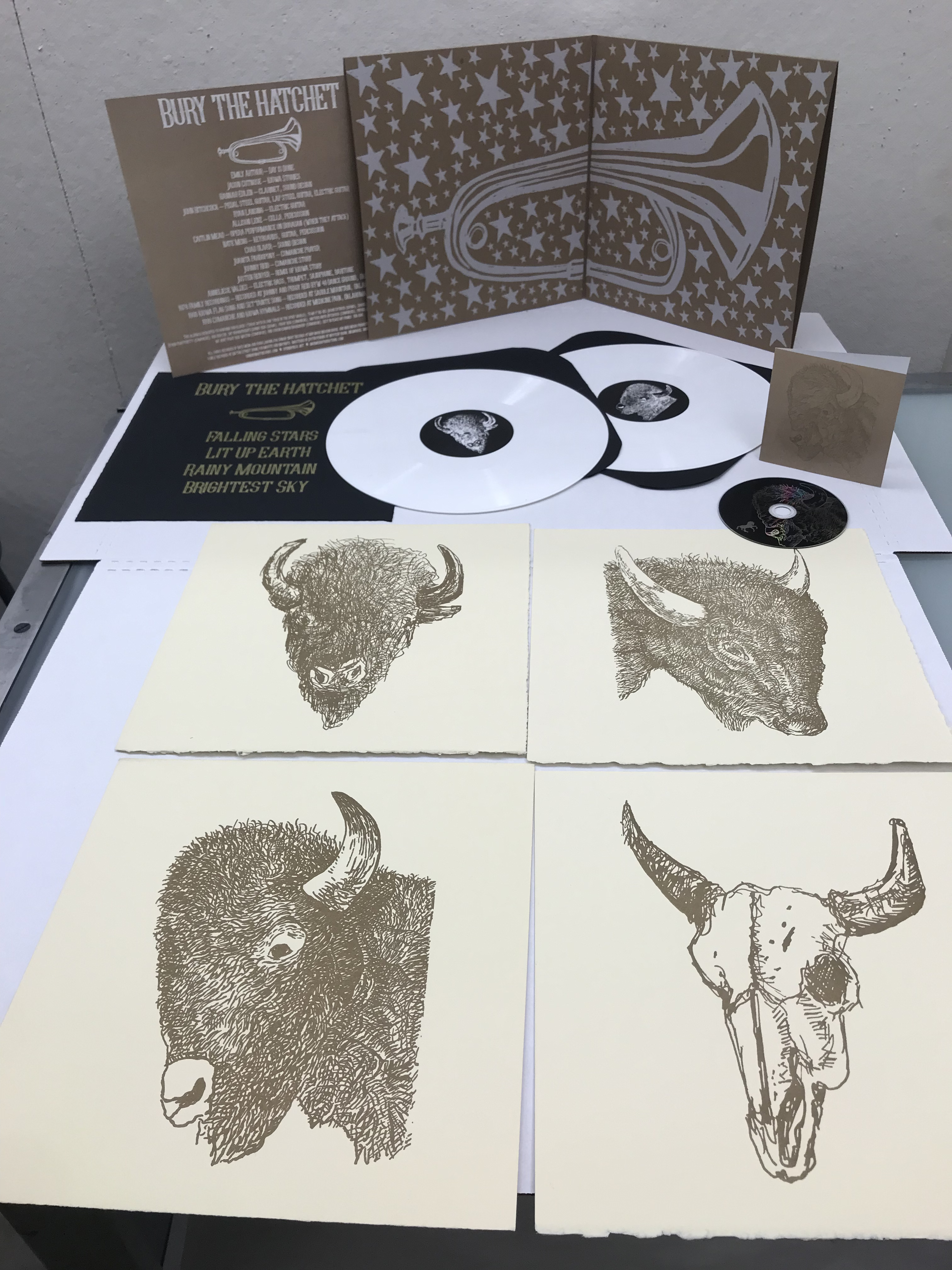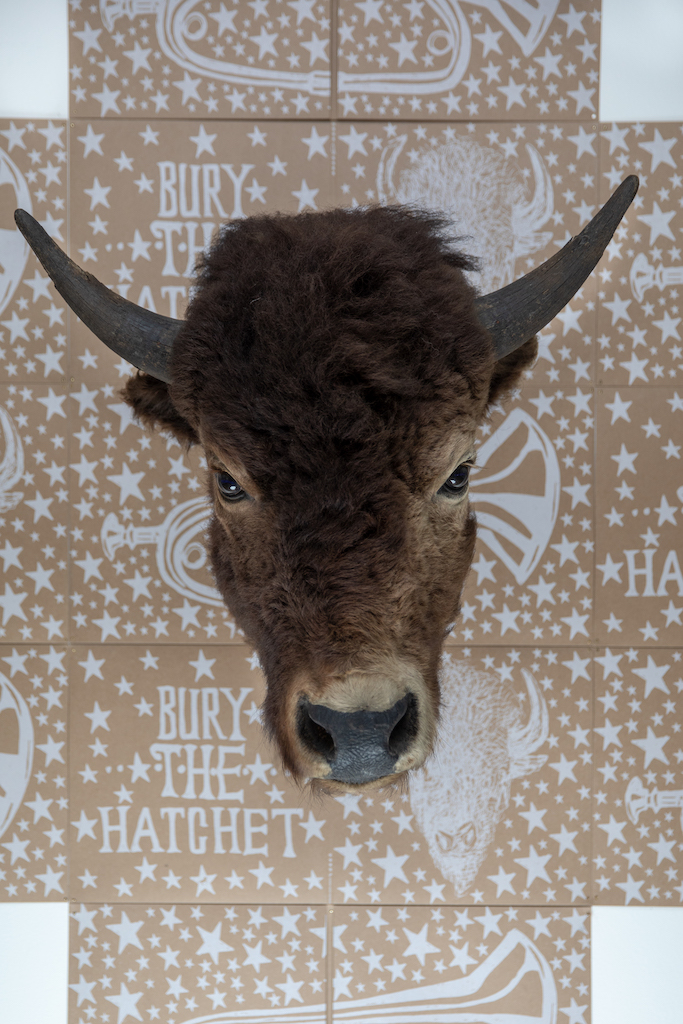 Bury the Hatchet: A Prayer for My P’ah-Be is artist John Hitchcock’s mixed-media, cross-disciplinary, multisensory installation. Hitchcock combines his interests in printmaking, Rock ‘n’ Roll, and Kiowa and Comanche history into one visual expression that offers a re-telling of the narrative of the American Frontier. Working from the theme of the Buffalo Bill Wild West Show, Bury the Hatchet explores issues of assimilation, acculturation, and indoctrination through oral history and music. Bury the Hatchet develops a shared language to interrogate historic and modern institutions to prompt a re-definition and re-imagining of our present reality.