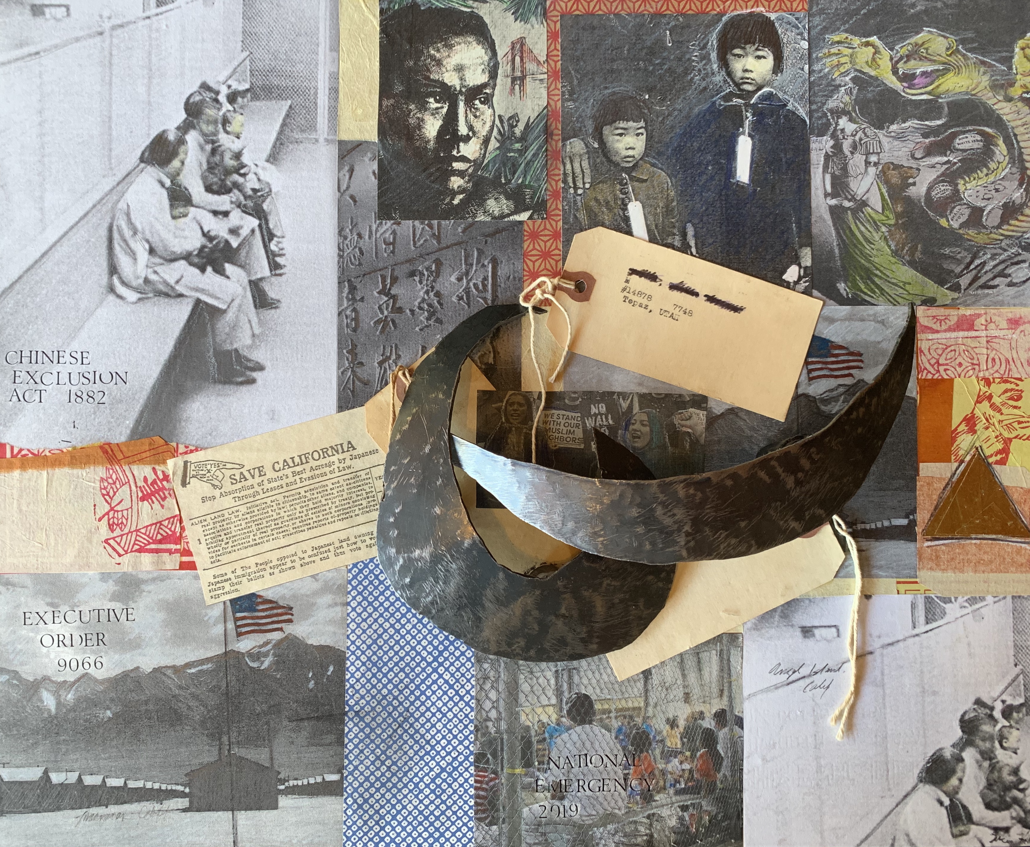 For Lucien Kubo, this assemblage is a reminder that we must learn from past injustices. She states, “During WWII, Japanese immigrants and American citizens of Japanese descent were incarcerated in 10 concentration camps. In2004, a report released by the American Civil Liberties Union in 2004 states that after the 9/11 attacks, the U.S. government unfairly deported thousands of immigrants simply because they were from Muslim countries. And now, Latino/Mexican immigrants are being held in detention centers—families and children being separated.” Kubo comments, “Scapegoating of racial groups, leads to prejudice and violence.”