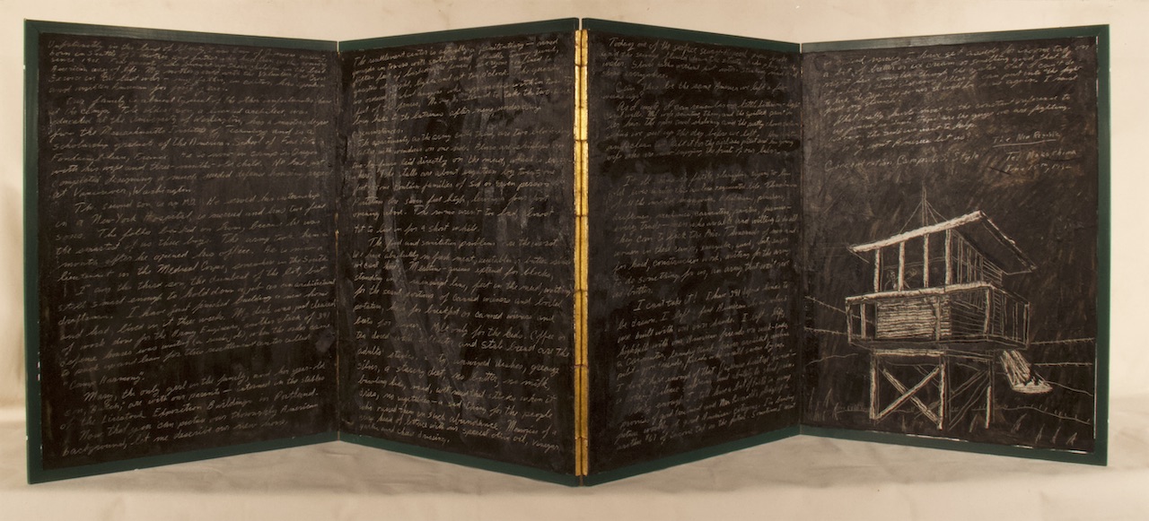 acrylic, newspaper collage and mixed media on folding screen, 24” x 72” x 12”