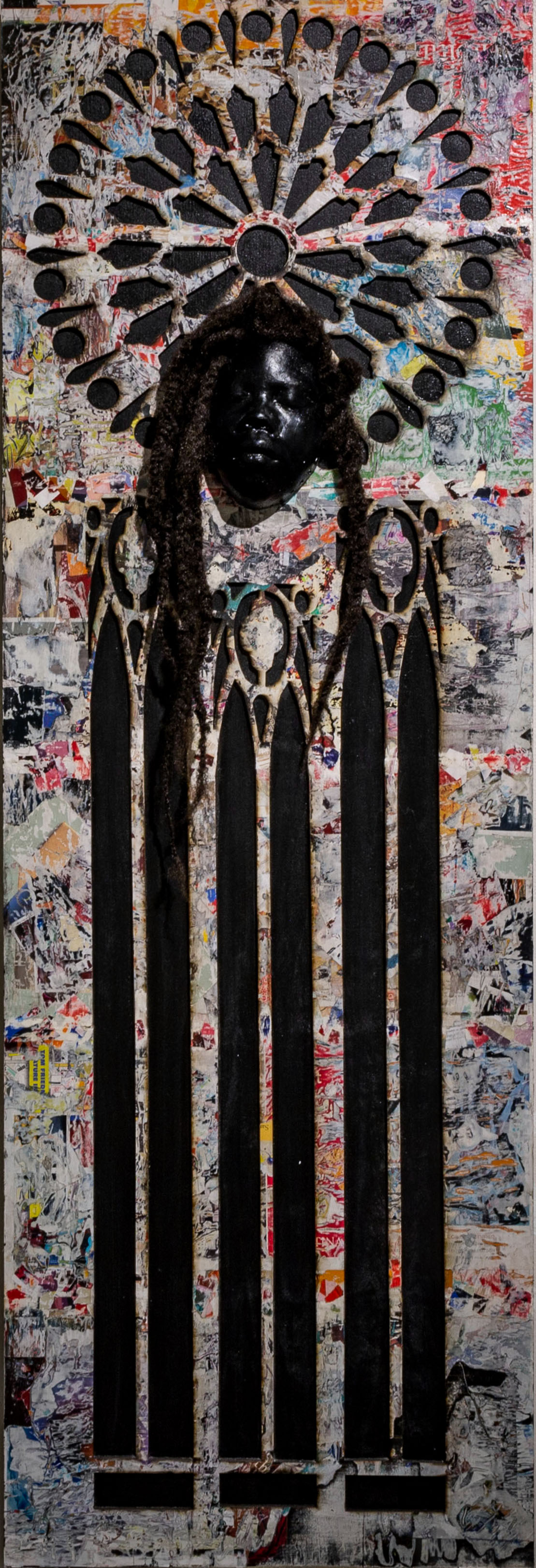 Marley hair, porcelain, newspaper advertisements, wood