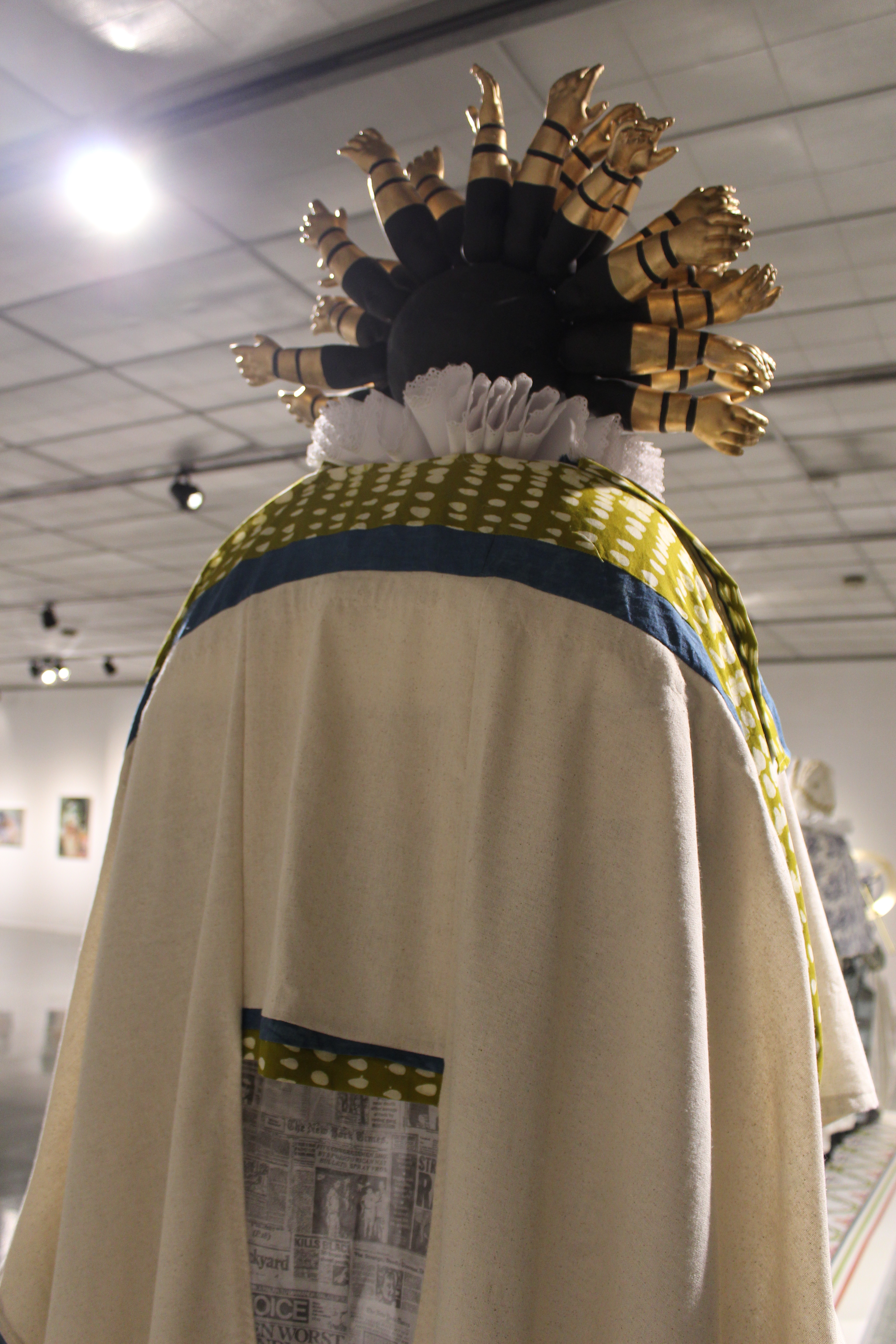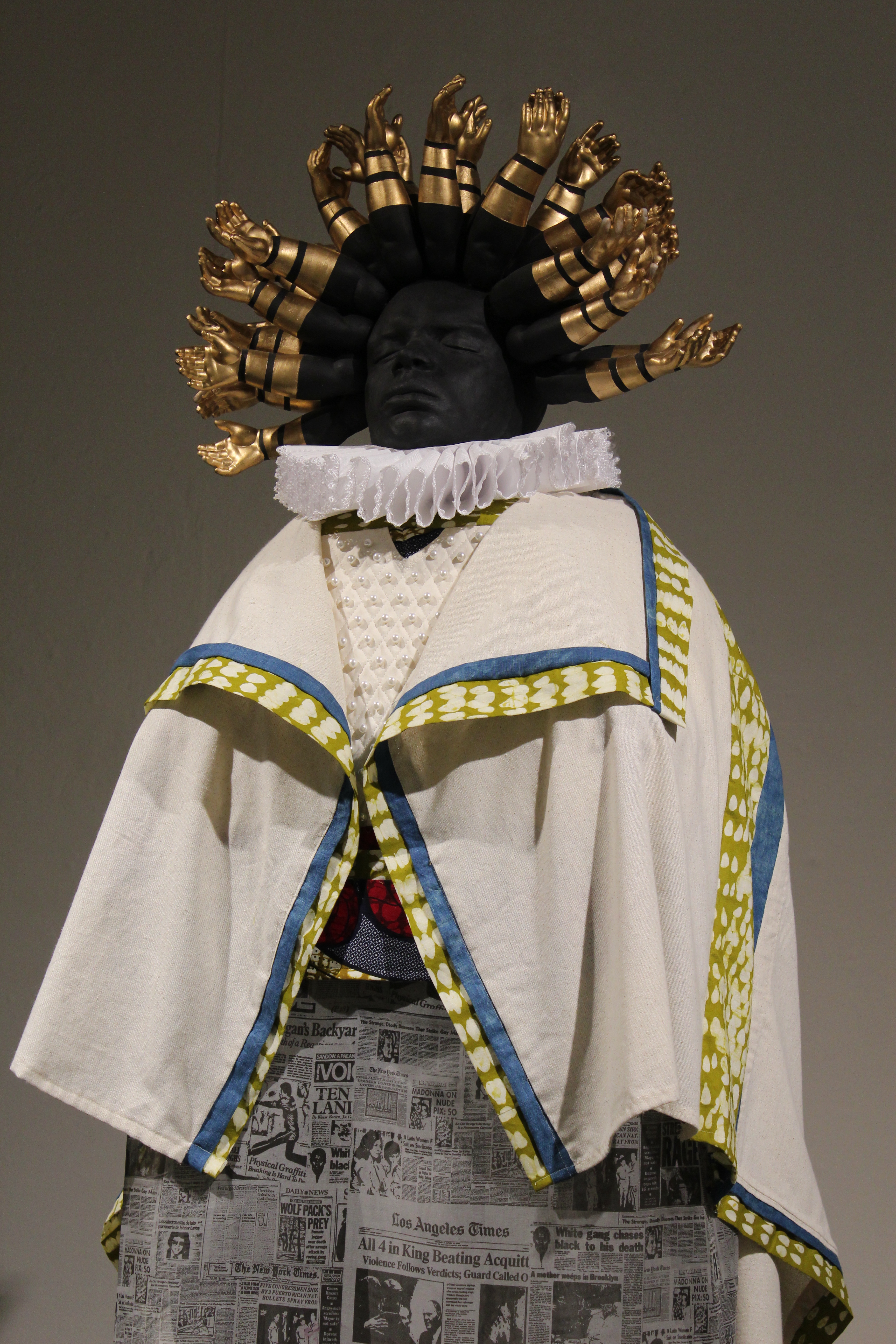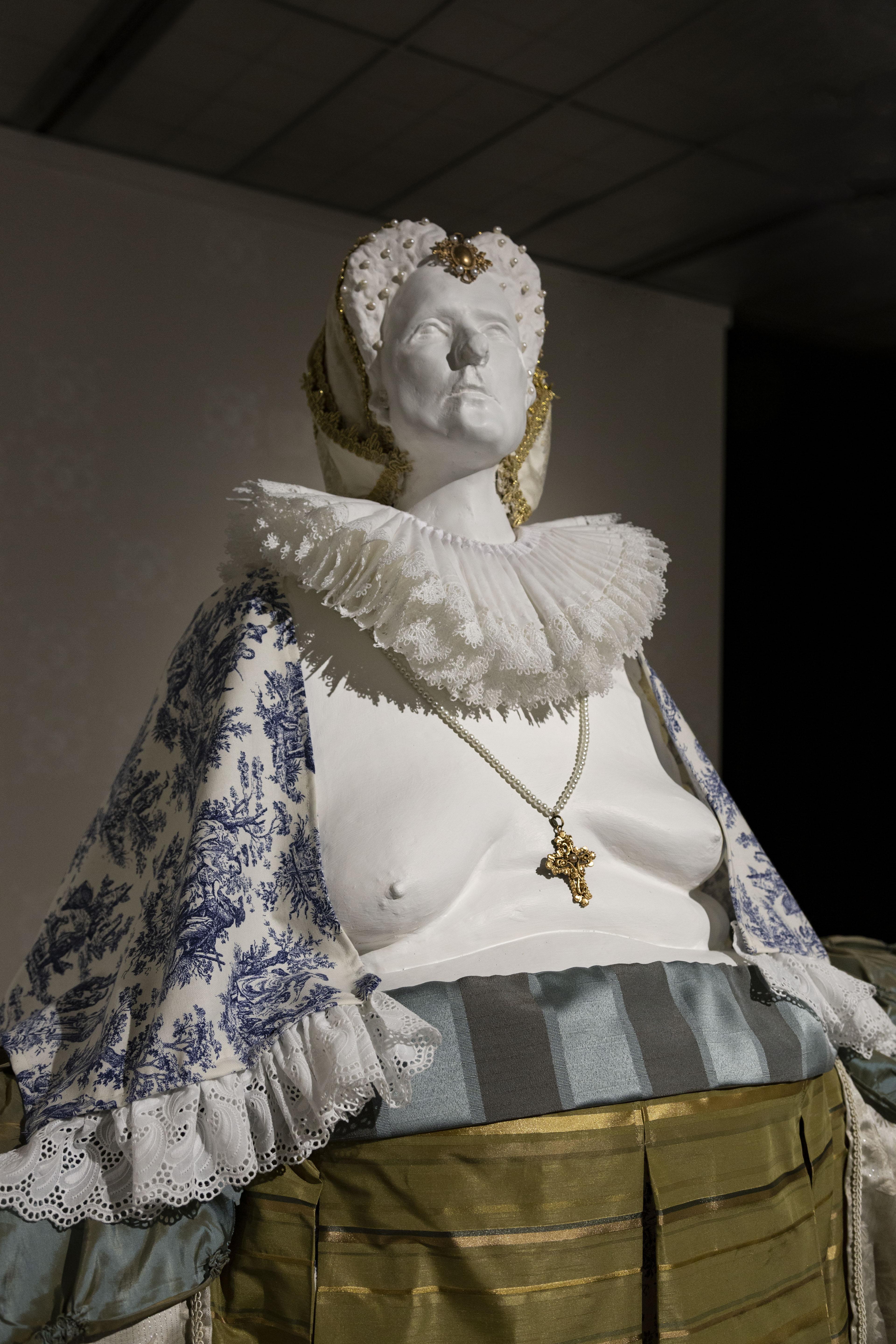 Osnaburg, linen, coffee stained muslin, Dutch-wax prints, digitally printed organza, ruff, indigo, porcelain, terra cotta, gilding, pearls