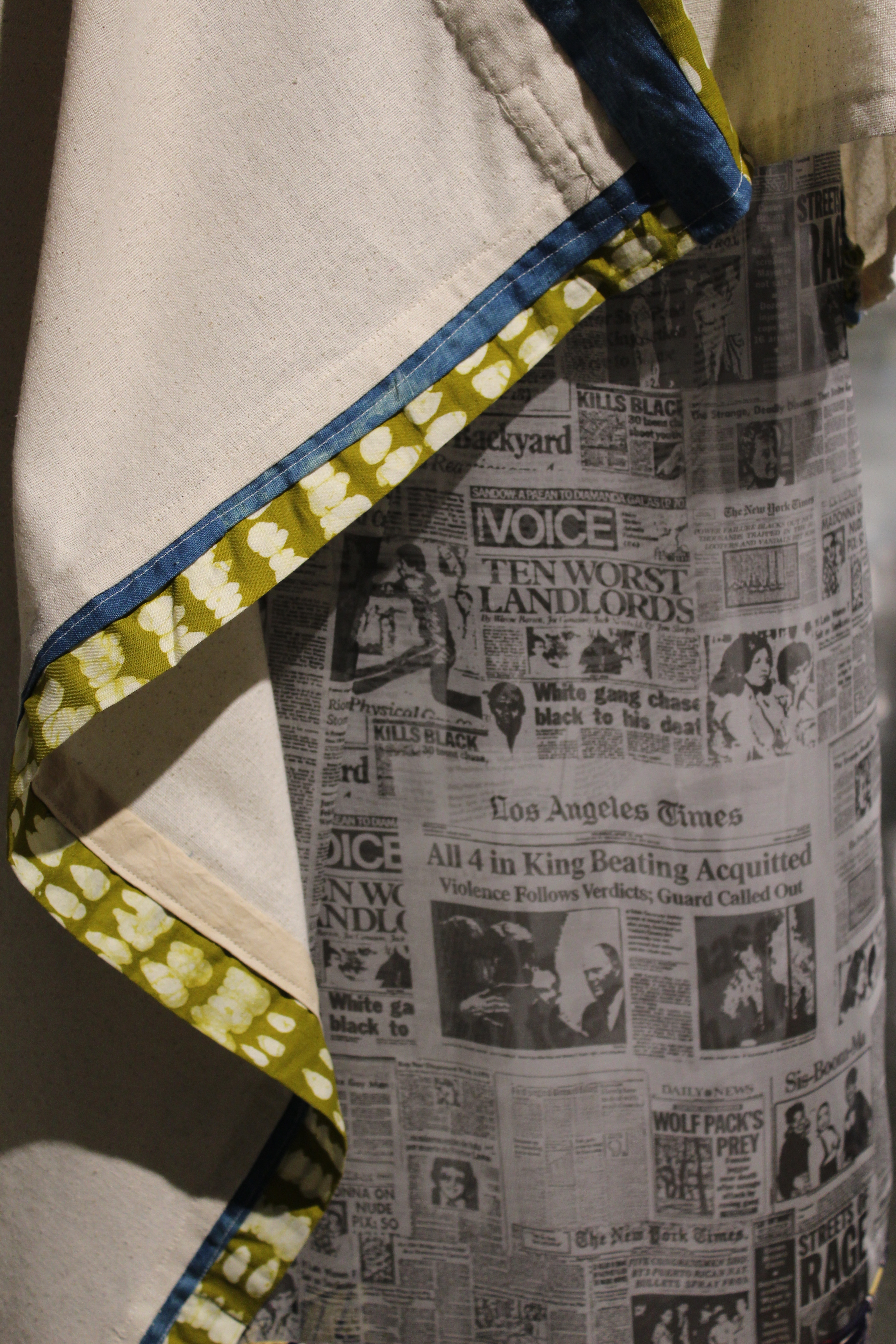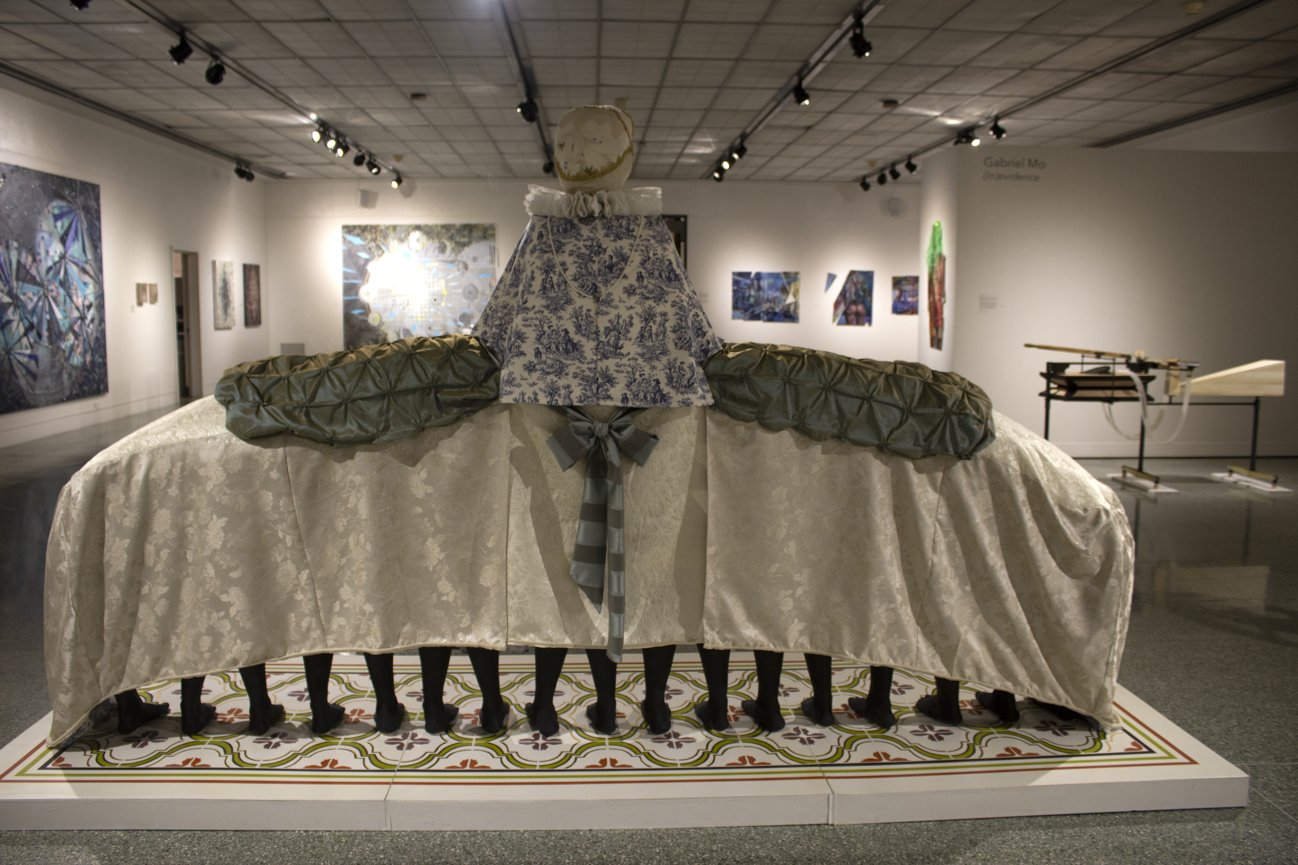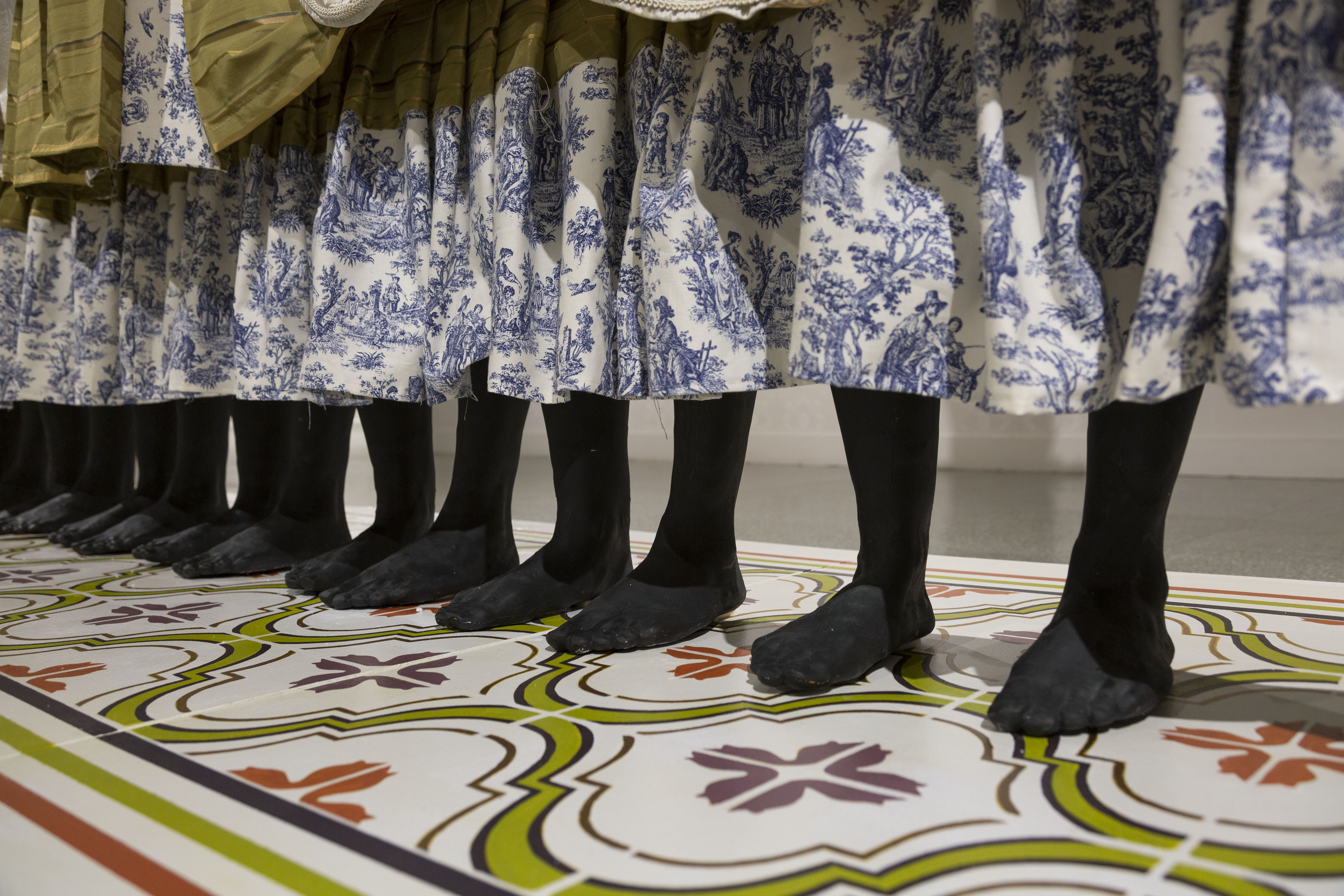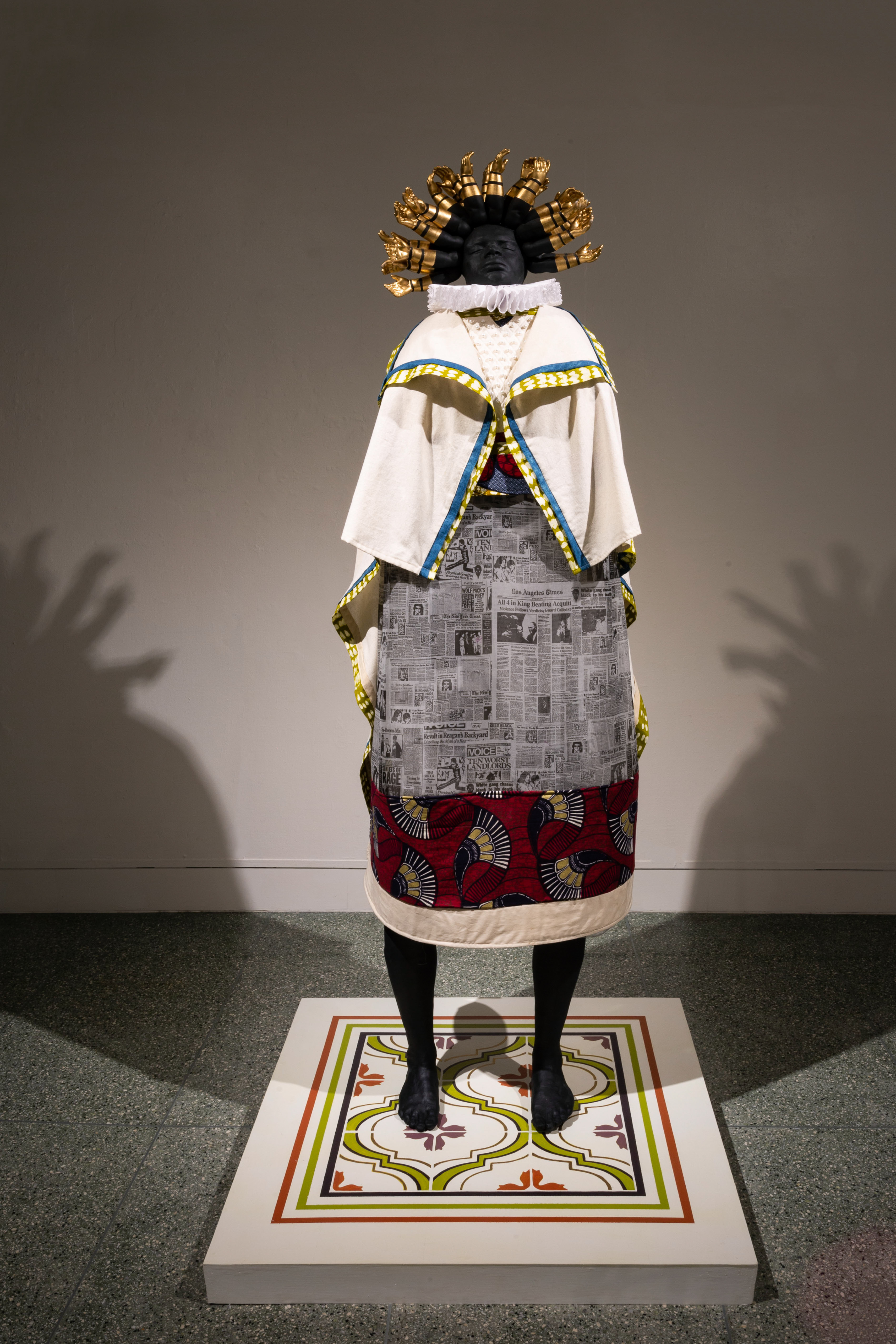 Osnaburg, linen, coffee stained muslin, Dutch-wax prints, digitally printed organza, ruff, indigo, porcelain, terra cotta, gilding, pearls