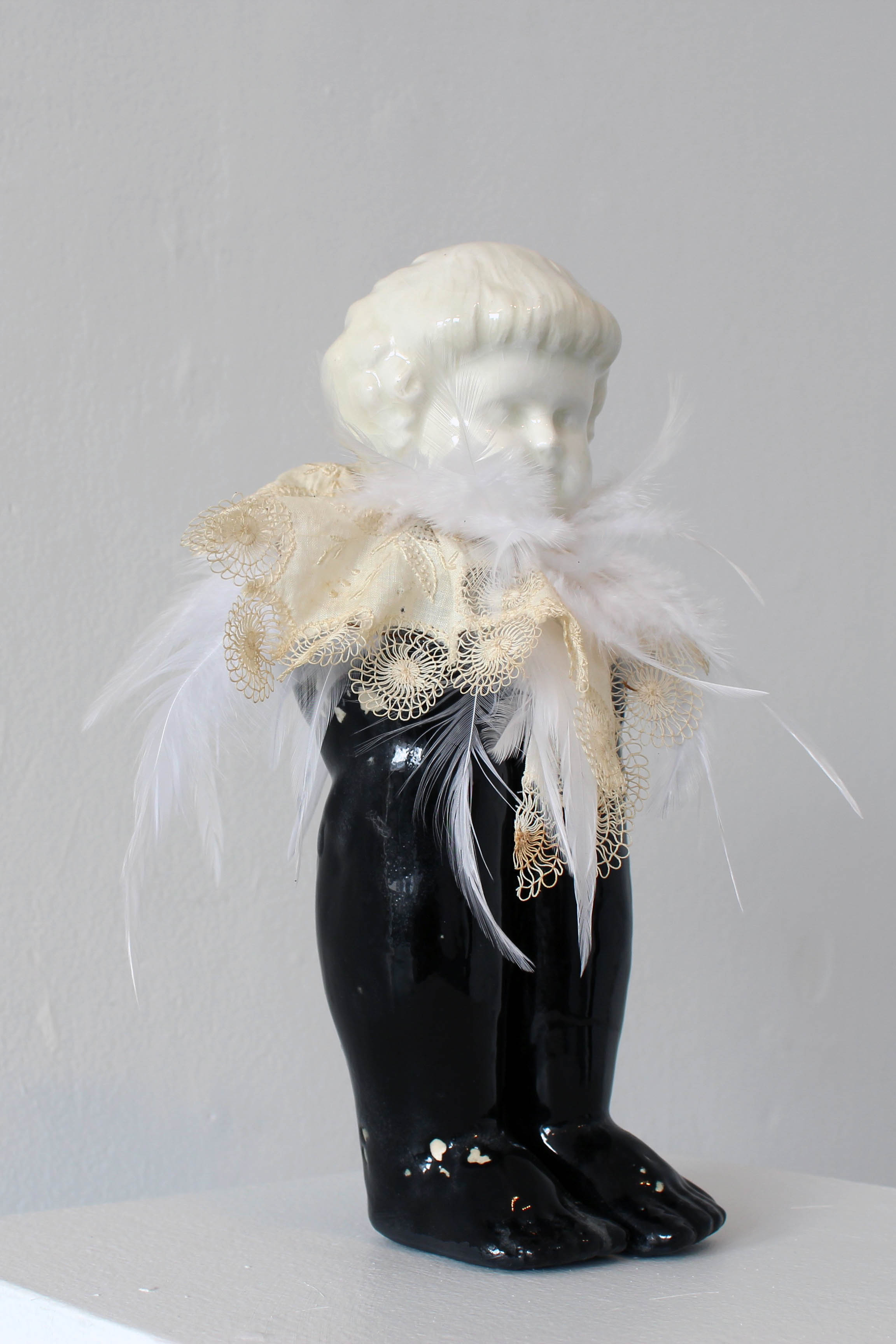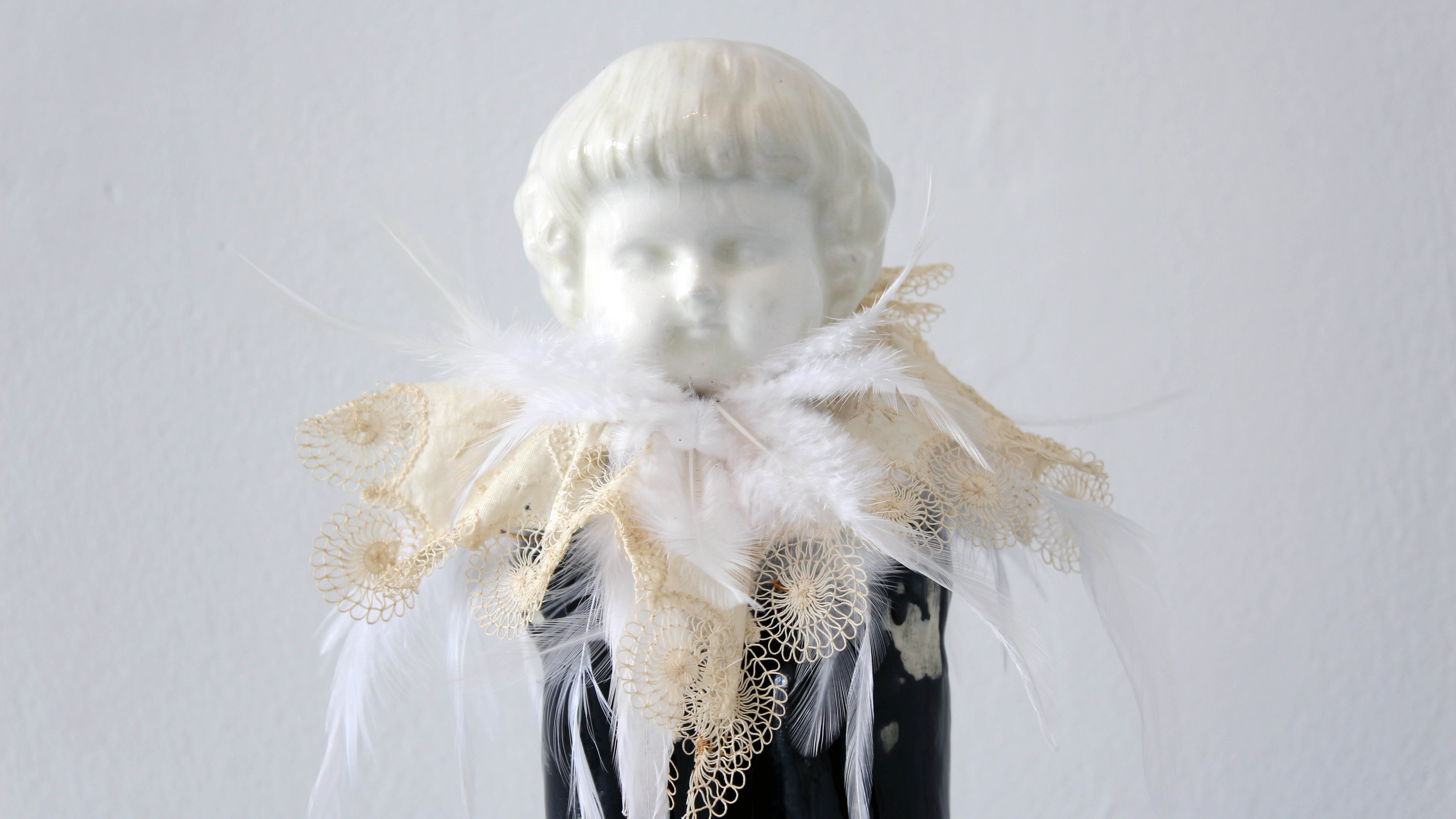 Porcelain, antique linens, feathers