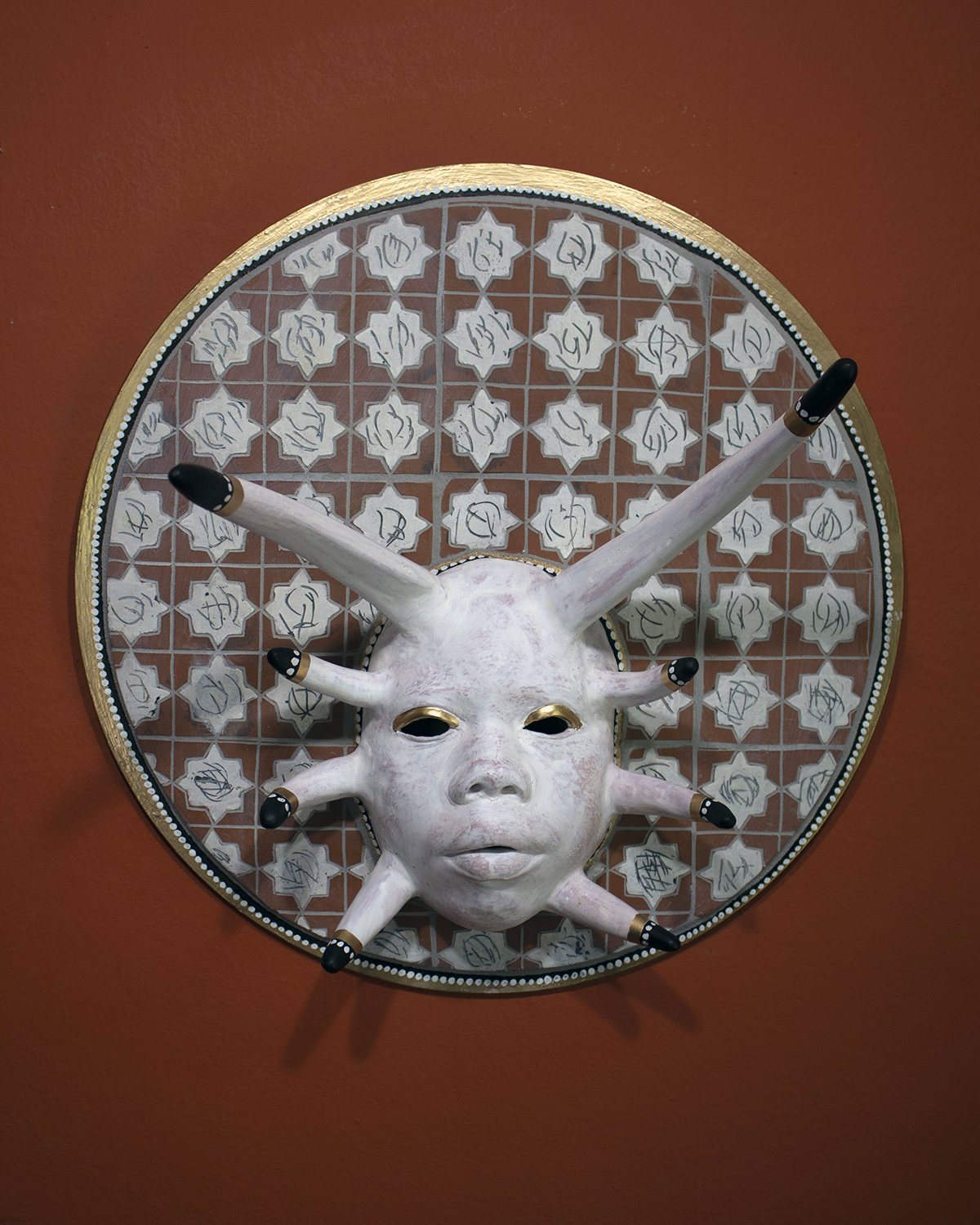 terracotta, black and white terra sigillata, grout, wood, gilding