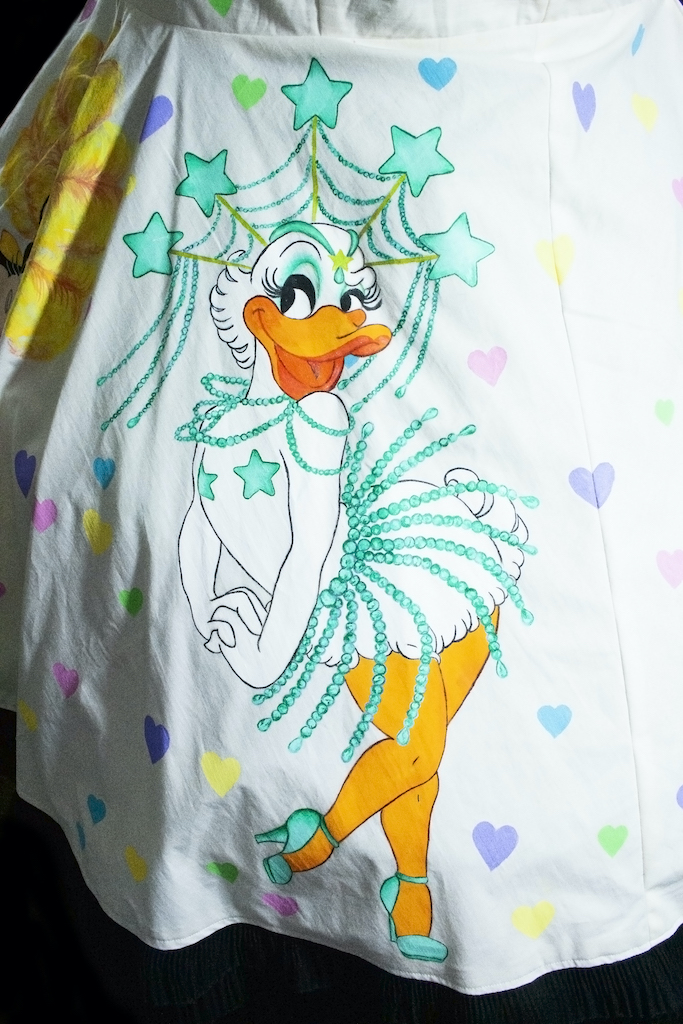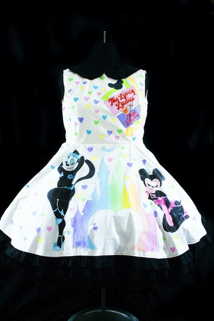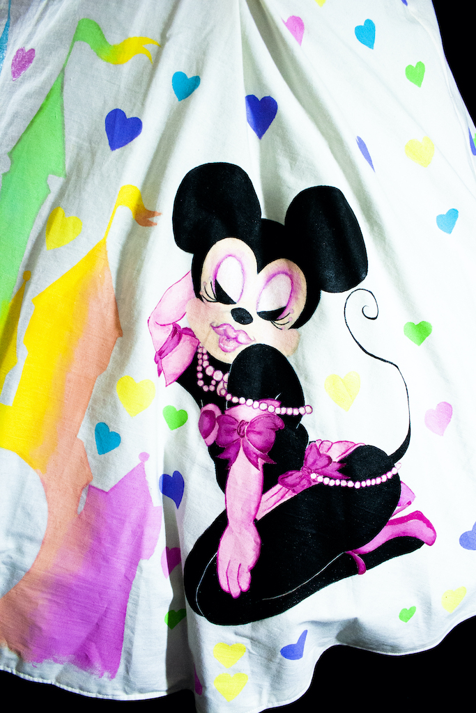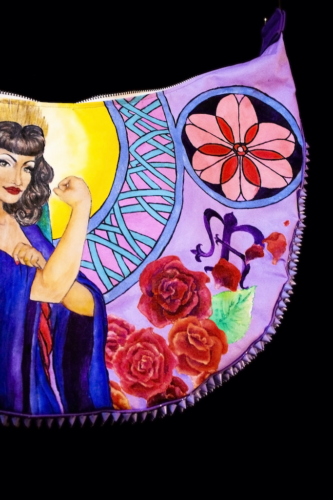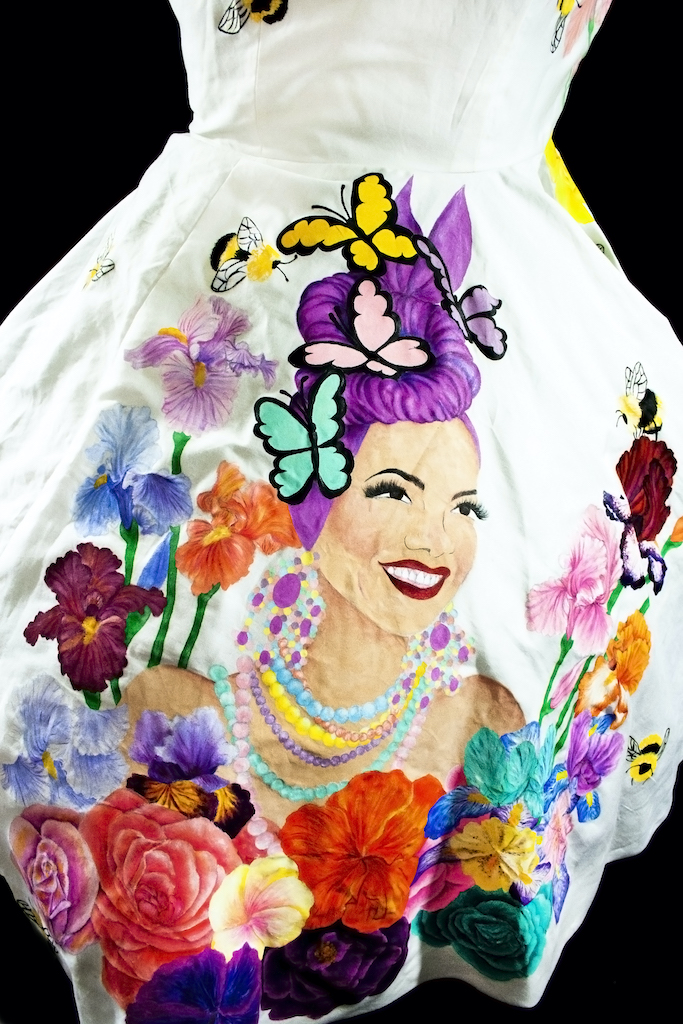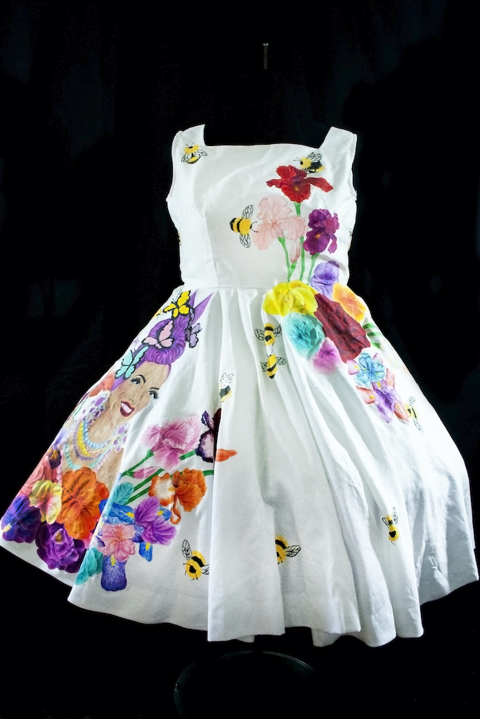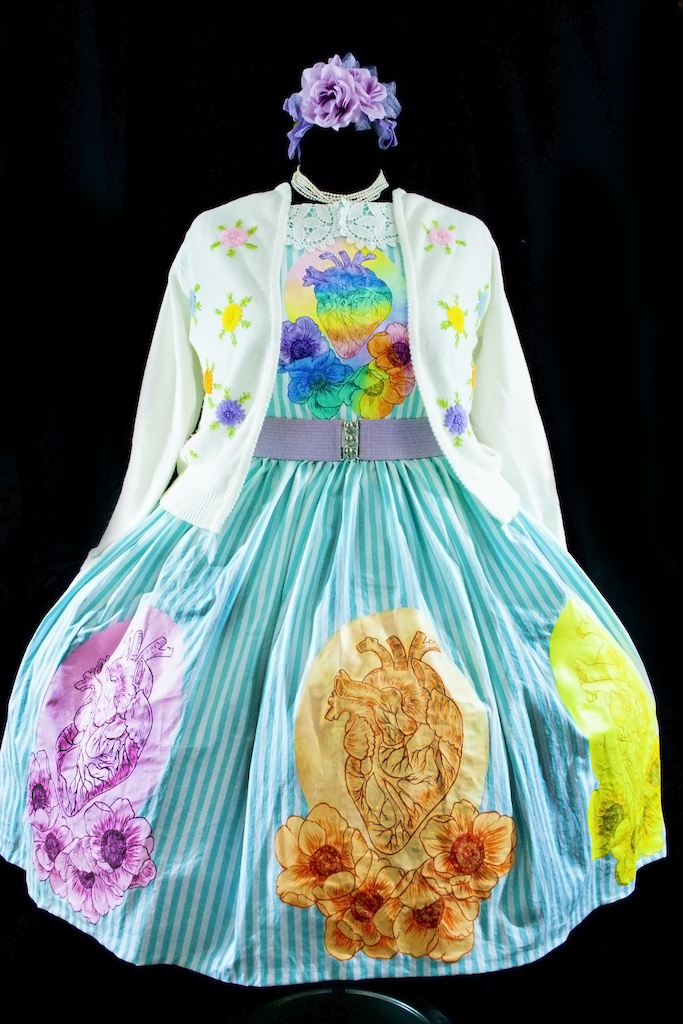 My work is an expression of what I'm feeling at the time, in a way my art is an extension of me. Within this show I found it interesting to have the isolation of the lockdown but the comfort of knowing that, though I am creating alone together with my fellow artists we are making something together. Something uniquely mine and my feelings during this time, and I felt the need to find joy. That even in this suffering there can be joy even if it's for no reason, I just want someone to see my work and smile even if it's for a fleeting moment. In my darkest hour finding a small bit of joy made things just a little bit better. Amongst that, it is important to me to have representation of all types of beauty, shapes, and sizes in my work. All is beautiful to me and it's something I believe in. I am inspired by the font and avant garde designers of Elsa Schiaparelli, the classic silhouettes of Dior's New look, the artistry of Guo Pei, and the playfulness of Moschino . I am visually influenced by botanical illustrations, Art Nouveau, the Pre-Raphaelites art, Art Deco, the works of John Willie, Duane Bryers, Olivia De Berardinis, Gil Elvgren, Leroy Neiman, and Dan Decurlo. What I make whether it's textile wearable art, jewelry production, sculpture, paper art, photography, or traditional painting; is uniquely me and an extension of me. I know people have different artistic tastes so all I can hope for is that someone sees the beauty, whimsy, and sheerness of joy I'm attempting to convey.