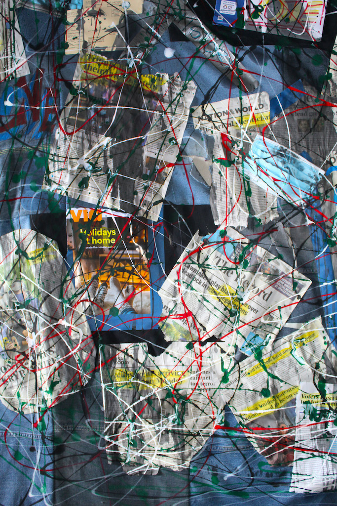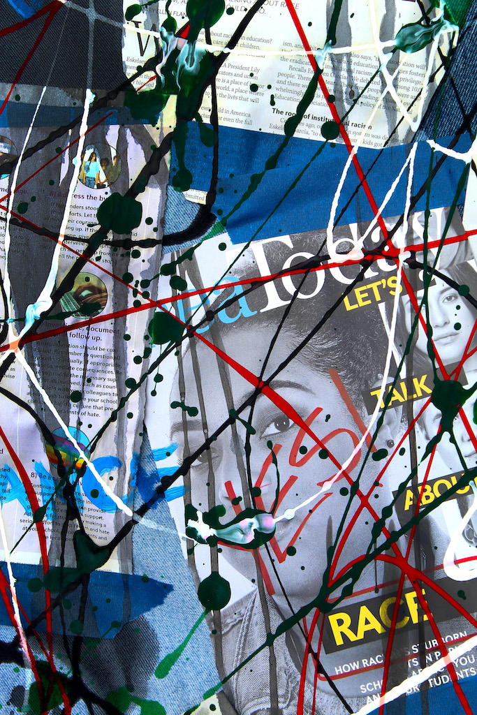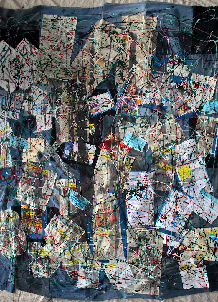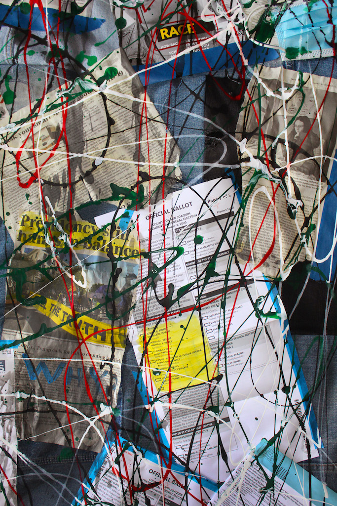 “Rags” is a large mixed media piece with ads, newspaper clippings, voting ballots, and left-over remnants of last year (2020). It represents the excessive bombardment of media in our lives. Creating a delicate dance between distinguishing truth from ambiguity.