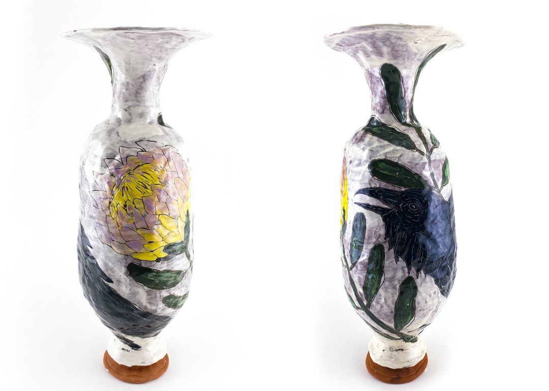 The pieces for this exhibition are from a body of work featuring tall, hand-built vases illustrated with colorful flora and fauna. The drawn animals, flowers and leaves are mundane: they are creatures whose shapes fill the background of our everyday lives. Each vessel contains a subtle, suggestive narrative. On the two outside vases, each animal is poised with a flower that may be poisonous while a bulging snake exists innocently between delicate tulips on the urn in between. Together, they form a scene with two animals on the outskirts of a dangerous predator. These pieces are shown coexisting together to highlight their presence outside of our human lives and the intricate tension on each form – everybody in between and altogether. While we coexist with the flora and fauna that make up our lives, there is a delicate tension between life and death and the simultaneous destruction of our existence.